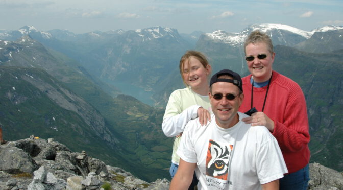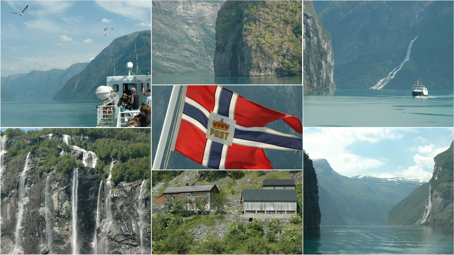 Am Mittwoch setzen wir unsere Reise fort und obwohl ich noch eine Runde gelaufen bin, ist das Auto nach dem Frühstück um 10:15 Uhr fertig zur Abfahrt. Leider verlassen wir unsere Hütte an diesem schönen See in Løken und folgen nun der 60 von Olden weiter an das Nordufer des Innvikfjords nach Stryn. Mit der 15 NW erreichen wir vor Grodås am Hornindalsvatnet wieder die E39, die wir allerdings über die 60 Nordost nach Hellesylt wieder verlassen. Wir sind um 11:30 in Hellesylt und wollen hier mit dem Fährschiff den berühmten Geiranger- Fjord bis Geiranger befahren. Das nächste Schiff fährt allerdings erst um 12:30 Uhr, so nutze ich die Zeit und kaufe mir in einem Outlet einen Wollpullover, den ich bis heute zu meinen Lieblingspullovern zähle. Die Durchfahrt durch den Geiranger- Fjord gilt als eines der Landschafts- Highlights Norwegens. Der Fjord schlängelt sich in WO- Richtung entlang steiler Felswände und spektakulärer Wasserfälle wie den „Sieben Schwestern“ durch eine fantastische Hochgebirgslandschaft. Gelegentlich sehen wir Höfe an den exponierten Berghängen. Am Ende des Fjords füllt der Schornstein eines Kreuzfahrtschiffs den Fjord mit einer Dunstglocke aus Abgasen. Es ist kein schöner Anblick und ein Umweltproblem, gegen das es in Norwegen zukünftig strengere Auflagen geben wird.