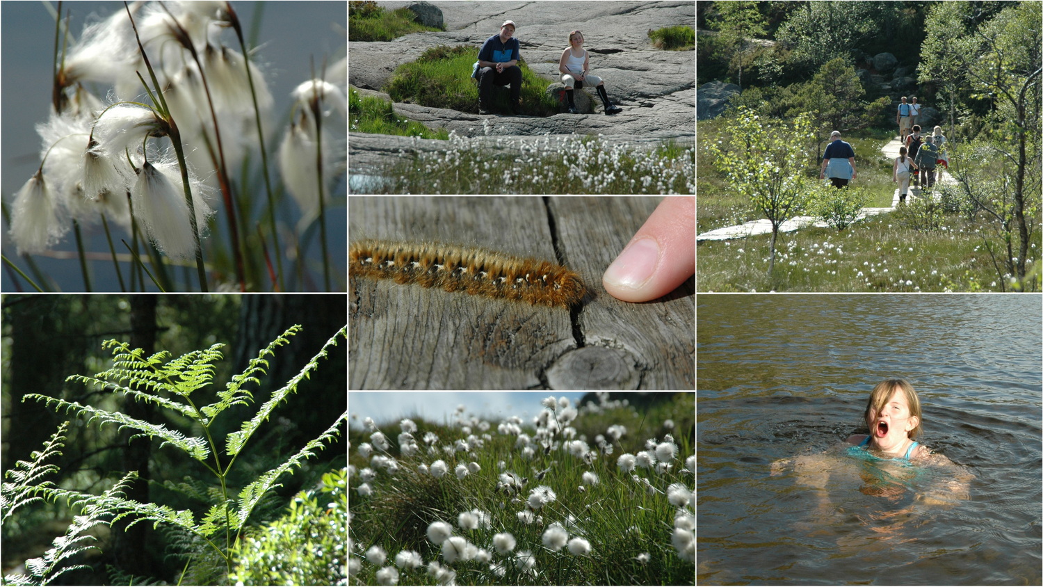 Wir steigen auf dem Rückweg zunächst weitere 100 Höhenmeter zum höchsten Punkt des Moslifjells auf 718 Meter. Über die Gletscherschliffe des ehemaligen Lysefjordgletschers, der die Landschaft hier während der letzten Eiszeit geschaffen hat, steigen wir ab durch das Moor Kroģebekkmyra und kehren bald wieder auf den Weg zurück, den wir am Morgen aufgestiegen sind. Um 17:50 Uhr sind wir zurück an unserem Quartier. Es ist Sommer und Anne hat sich fest vorgenommen im See baden zu gehen. Obwohl sie die Wassertemperatur überschätzt hat, hält sie das nicht davon ab einmal komplett unterzutauchen. Nach dem Essen machen wir wieder ein paar Spiele am Tisch im Gastraum. Es ist 6 Tage nach Mittsommer, dem längsten Tag des Jahres, den wir mit unserer Anreise also nur knapp verfehlt haben. So ist es beim Schlafengehen gegen 23:00 Uhr nicht dunkel draußen und beim nächsten Blick aus dem Fenster um 3:00 Uhr bereits taghell.