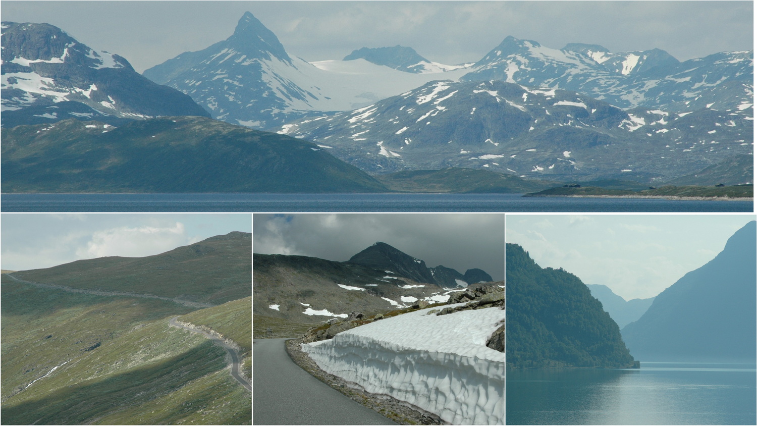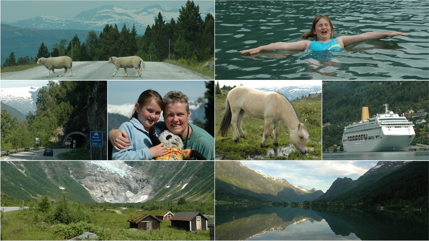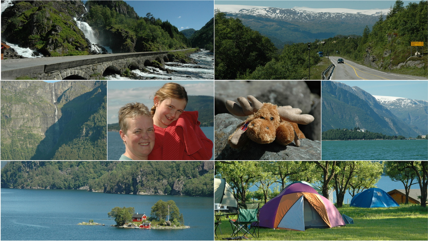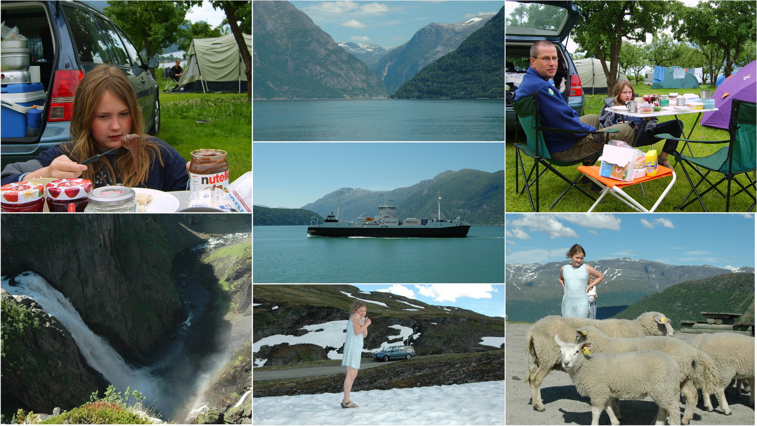 Am Freitag begeht Dorothee ihren 42. Geburtstag und wir kommen nach dem Zeltabbau erst gegen 11:00 Uhr los. Die 13 Nord bringt uns nach Brimnes und dann über die 7 in östlicher Richtung über Eidfjord zwischen Hallingskarvet- NP und Hardangervidda an den Vøringsfoss. Am Aussichtspunkt an der Straße am Fossli Hotel ist man nicht einsam. Hier ist reichlich Rummel, Busse entladen Touristengruppen und Verkaufsstände bieten Souvenirs, auch in Form von Rentierfellen. Wir fahren wieder zurück bis Brimnes, wo uns die Fähre über den Hardangerfjord nach Bruravik bringt. Diese Fähre ist heute Geschichte, denn im August 2013 wurde hier westlich von Brimnes eine Brücke über den Fjord eröffnet. Zurück auf der 13 nehmen wir wieder Nordkurs auf über Granvin und durch den 7,4 Kilometer langen Tunsbergtunnelen weiter über Voss nach Vinje. Von hier fahren wir über eine Passstraße hinauf in das Skigebiet Myrkdalen Fjellandsby. An der Passhöhe, auf 986 Metern vergnügt sich Anne im Sommerkleidchen und mit Sandalen auf den noch vorhandenen Schneeflecken auf der Hochebene. Es geht durch großartige Landschaft, wir treffen Schafe an der Straße und halten an einem Aussichtspunkt mit Blick auf den Sognefjord.