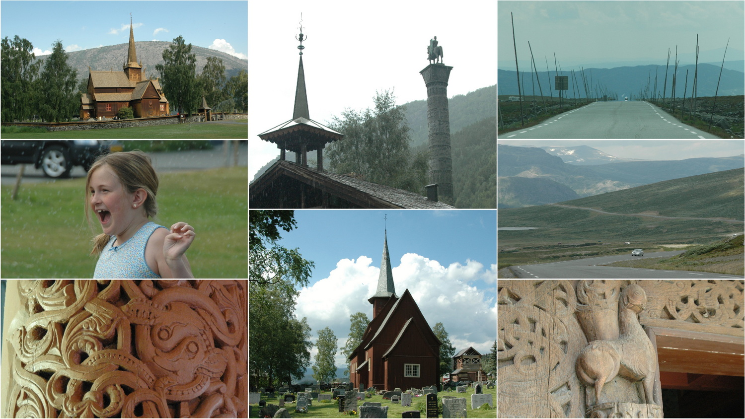 Am Freitagmorgen heißt es wieder Auto packen und Abschied nehmen von unserem gemütlichen Blockhaus und der freundlichen Vermieterin. In Lom scheint am Morgen beim Besuch der Stabkirche aus dem 12.Jahrhundert wieder die Sonne. Trotz des gestrigen Regens wird der Rasen vor der Kirche mit einem Rasensprenger befeuchtet und Anne hat einen Heidenspaß immer wieder durch die Regenfontäne zu rennen. Über die 15 Ost fahren wir bis Randen und zweigen auf die 51 Süd ab. Am Ostrand des Jotunheimen-NP fahren wir wieder durch eine weitläufige Hochgebirgslandschaft mit Passhöhen von 1390 und 1166 Höhenmetern bis zur Ortschaft Hegge mit seiner Stabkirche. Sie wurde zwar 1180 errichtet, erfuhr aber Umbauten unter Erhaltung alter Anteile.