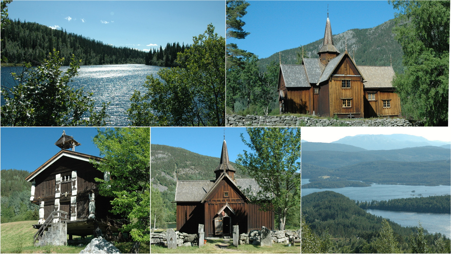 Aber auch der Nachbau in Gol macht einen guten Eindruck, 10 lokale Handwerker haben 10 Jahre lang an der Kirche gebaut und sie wurde 1994 geweiht. Ob der Bau, für den regionale Hölzer verwendet wurden auch in 800 Jahren noch steht? In Gol füllen wir den Tank auf, den wir fast bis auf den letzten Tropfen leer gefahren haben. Kaffee, Kuchen und Eis steht an, bevor wir uns wieder auf den Weg machen. Es geht über die 7 Ost bis Børtnes, wo wir auf die 287 abzweigen. Die Straße bringt uns in das Skigebiet von Haglebu, wo uns eine geschotterte Mautstraße in südwestlicher Richtung durch eine idyllische Wald- und Seenlandschaft auf die 40 Süd am Norefjord entlang nach Nore bringt. Auch in Nore gibt es eine Stabkirche mit einer Datierung, die auf das 12.Jahrhundert zurückgeht. Mit einigen Umbauten im 17. und 18. Jahrhundert ist die hübsche Kirche leider nicht im historischen Original erhalten. Restauratoren der Uni-Oslo arbeiten hier an der Innen-Ausmalung und empfehlen uns auch den Besuch der Stabkirchen von Torpo an der 7 und von Uvdal an der 40. An beiden sind wir leider schon vorbei, es ist 17:00 Uhr und langsam müssen wir uns auch Gedanken über unser nächstes Nachtlager machen.