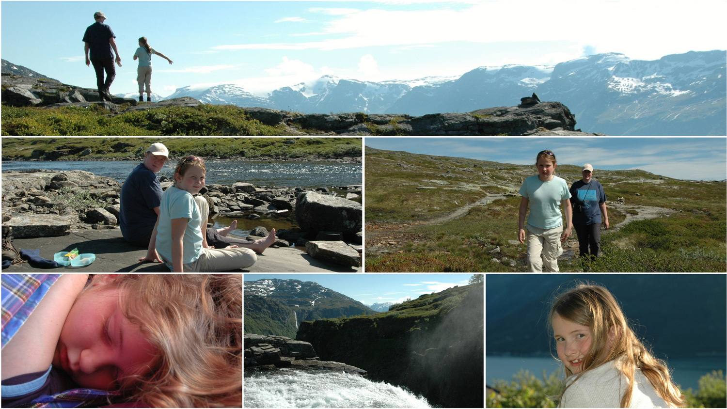 Die Mühe lohnt sich und mit dem Erreichen der Oberkante der Felswand nach etwa 3,5 Stunden, an der sich der Rjukandefoss in den Fjord ergießt, öffnet sich der Blick in die weite Hardangervidda nach Osten und westwärts über den Sørfjord hinweg auf den Folgefonna- NP. Der benachbarte Skrikjofoss, der schreiende Wasserfall stürzt mit einer Fallhöhe von 650 Metern in den Fjord. 2000 Rentiere leben auf der Hochebene der Hardangervidda. Es ist eine wunderschöne Landschaft, in der wir noch eine kleine Runde machen und auf den warmen Felsplatten an den rauschenden Wassern lange Pausen machen. So machen wir uns auch erst gegen 18:00 Uhr auf den Rückweg und erreichen den Zeltplatz gegen 20:00 Uhr, zu spät zum einkaufen. Wir kochen aus den Vorräten ein paar Nudeln und gehen danach schlafen. Sehr ungewohnt ist es, in den Schlaf zu kommen, wenn es draußen noch hell ist.