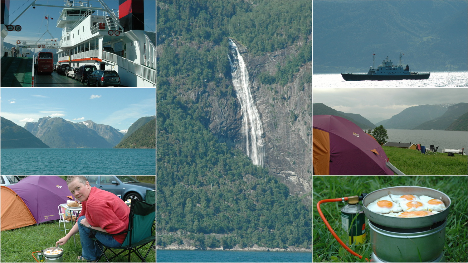 Steil geht es nun wieder hinunter auf Fjordlevel in den hübschen Ort Vikøyri, wo wir auf unsere erste Stabkirche in Norwegen stoßen. Es ist die Stabkirche Hopperstad, eine der ältesten mittelalterlichen Holzkirchen Norwegens von 1130 n.Chr. Die mehrstöckige pagodenartige Bauweise und die Drachenköpfe an den Dachfirsten wecken Assoziationen mit den Langbooten der Wikinger. Was ist das Geheimnis der Baumeister dieser Holzkirchen, die fast 900 Jahre nach ihrer Erbauung in den rauhen Landschaften Skandinaviens Wind und Wetter trotzen? Wir erreichen über die 13 Nord den Fähranleger in Vangsnes und setzen von hier nach Hella über. Auch auf dem Fjord öffnen sich großartige Rundblicke auf Berge, Gletscher und Wasserfälle. Am Sognefjord entlang fahren wir bis hinter Sogndal und bauen auf dem Kjørnes- Campingplatz unser Zelt mit Fjordblick für zwei Nächte auf. Wir haben ein Mini- TV Gerät dabei und verfolgen das Viertelfinale der Fußball-WM Deutschland gegen Argentinien, das mit einem 1:1 ins Elfmeterschießen geht. Deutschland kann das Duell mit 5:3 für sich verbuchen. Danach lassen wir Doros Geburtstag noch mit einem kleinen BBQ ausklingen.