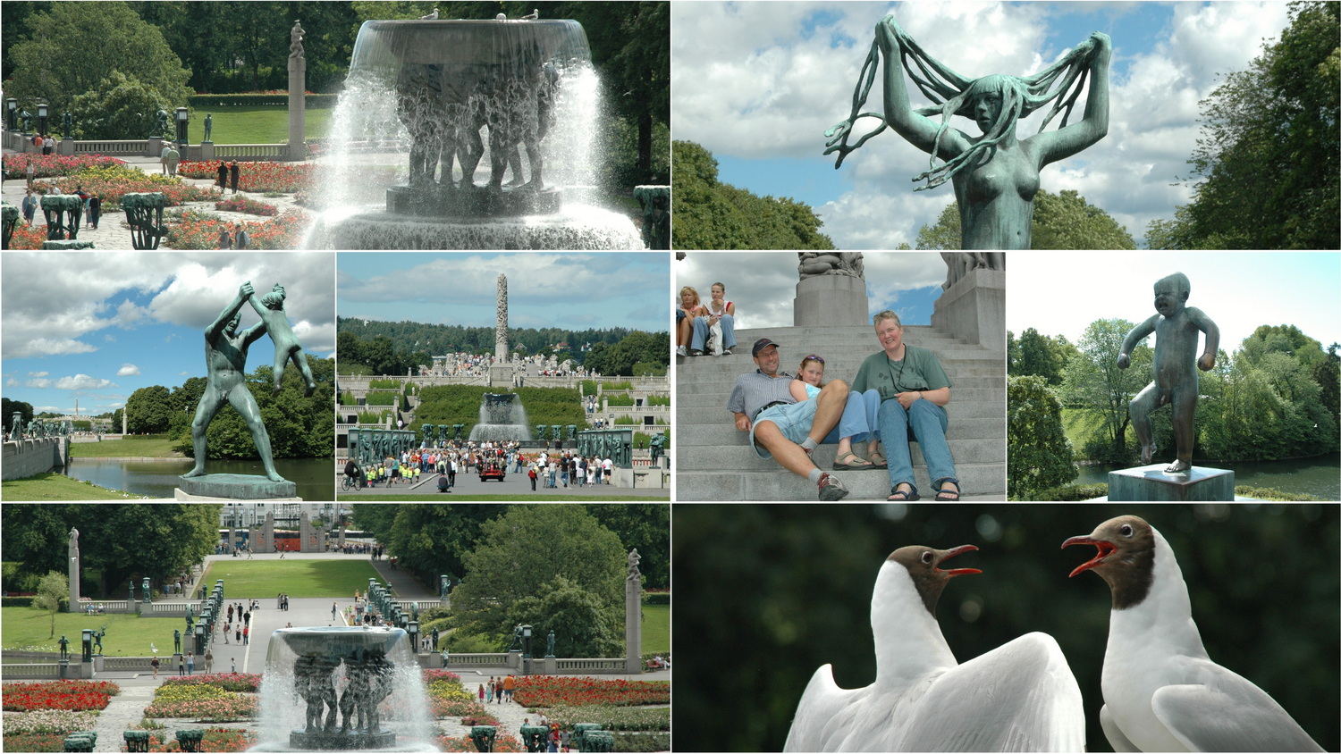 Hier treffen wir wie verabredet auf Familie Schröder, mit der wir uns nun die Skulpturen Gustav Vigelands (1869-1943) anschauen. Vigelands Skulpturen beschäftigen sich mit dem Kreislauf menschlichen Lebens und entstanden in den Jahren 1923 bis 1942. Am Fuß des Parkhügels befinden sich 58 Bronzeskulpturen mit dem Publikumsliebling „Sinnataggen“, dem zornig aufstampfenden Kind. Eine Treppenanlage führt an Brunnen vorbei zum „Monolitten“, einer 17 Meter hohen Granitsäule aus Iddefjord-Granit mit 127 Figuren, die von 36 Figurengruppen umgeben ist. In der wärmenden Sonne, inmitten der Granit- Plastiken genießen wir das nachmittägliche Treiben im Park. Wir essen noch eine Kleinigkeit im Park- Café, wonach wir uns von Norbert, Susanne, Lasse und Laura, die heute noch nach Lillehammer fahren verabschieden. Wir fahren mit der Straßenbahn 12 zum Rathausplatz.