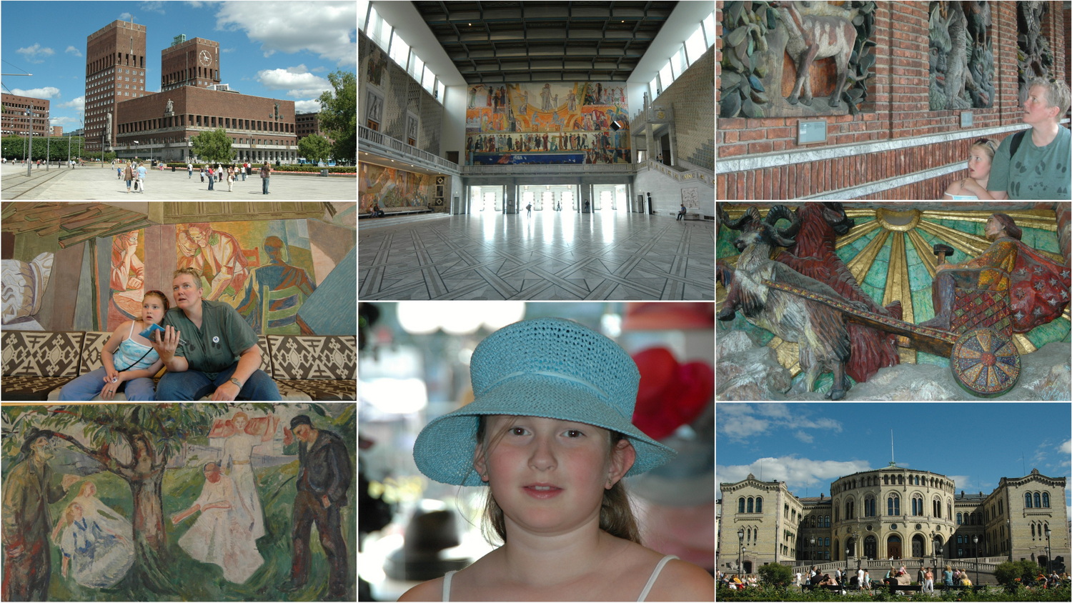 Nach der Auflösung der Union mit Schweden fiel die Entscheidung zum Bau des Osloer Rathauses im Jahr 1905. Erst nach zwei Weltkriegen wurde das Projekt am 15.Mai 1950 fertiggestellt. Entlang von Schnitzarbeiten, die die Gottheiten und Sagenwelt Norwegens aufgreifen betreten wir die 1500 Quadratmeter große Halle, in der jährlich am 10. Dezember, am Todestag Alfred Nobels der Friedensnobelpreis verliehen wird. Neben der Halle mit ihren Wandgemälden schauen wir in den Ratssaal und den Munchsaal mit Edvard Munchs Bild „Life“ hinein. Wir laufen die Karl Johans-Gate am Parlament vorbei zur Domkirche, die aber geschlossen ist. Wir werfen einen Blick in das Einkaufszentrum „GlasMagasinet“. Weiter geht es am Bahnhof durch die Østbanehallen, die heute als Geschäftspassage genutzt werden. Mit der Straßenbahnlinie 19 fahren wir die Karl Johans-Gate nun entlang bis zum Königsschloss, das seit 1991 Sitz von König Harald V. und seiner Frau Sonja ist.
