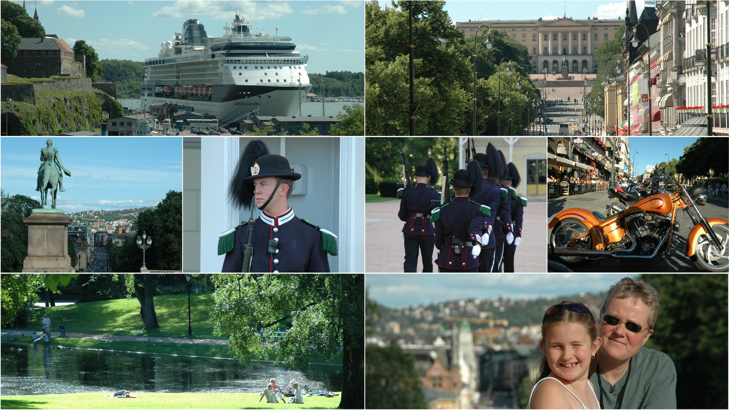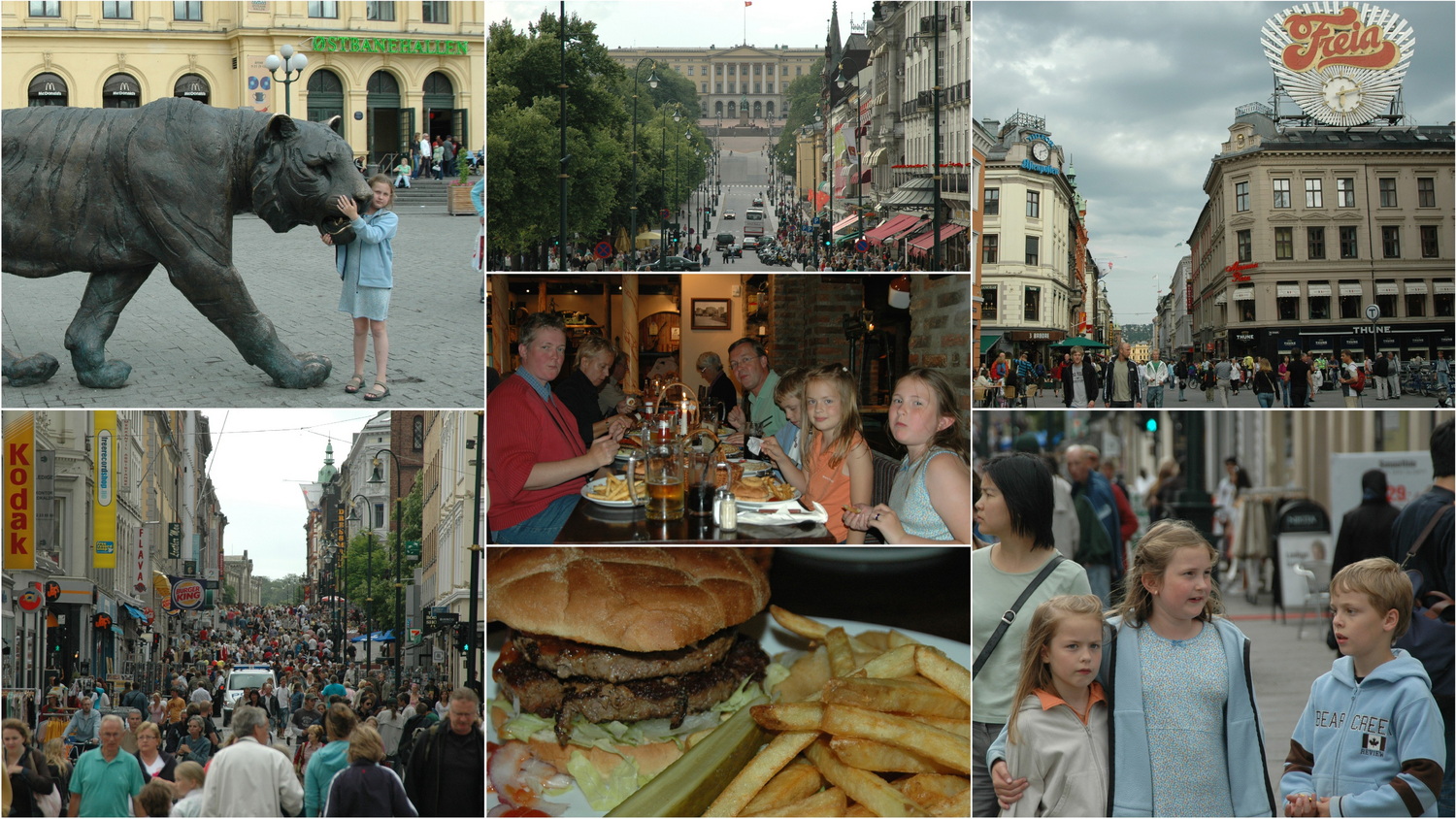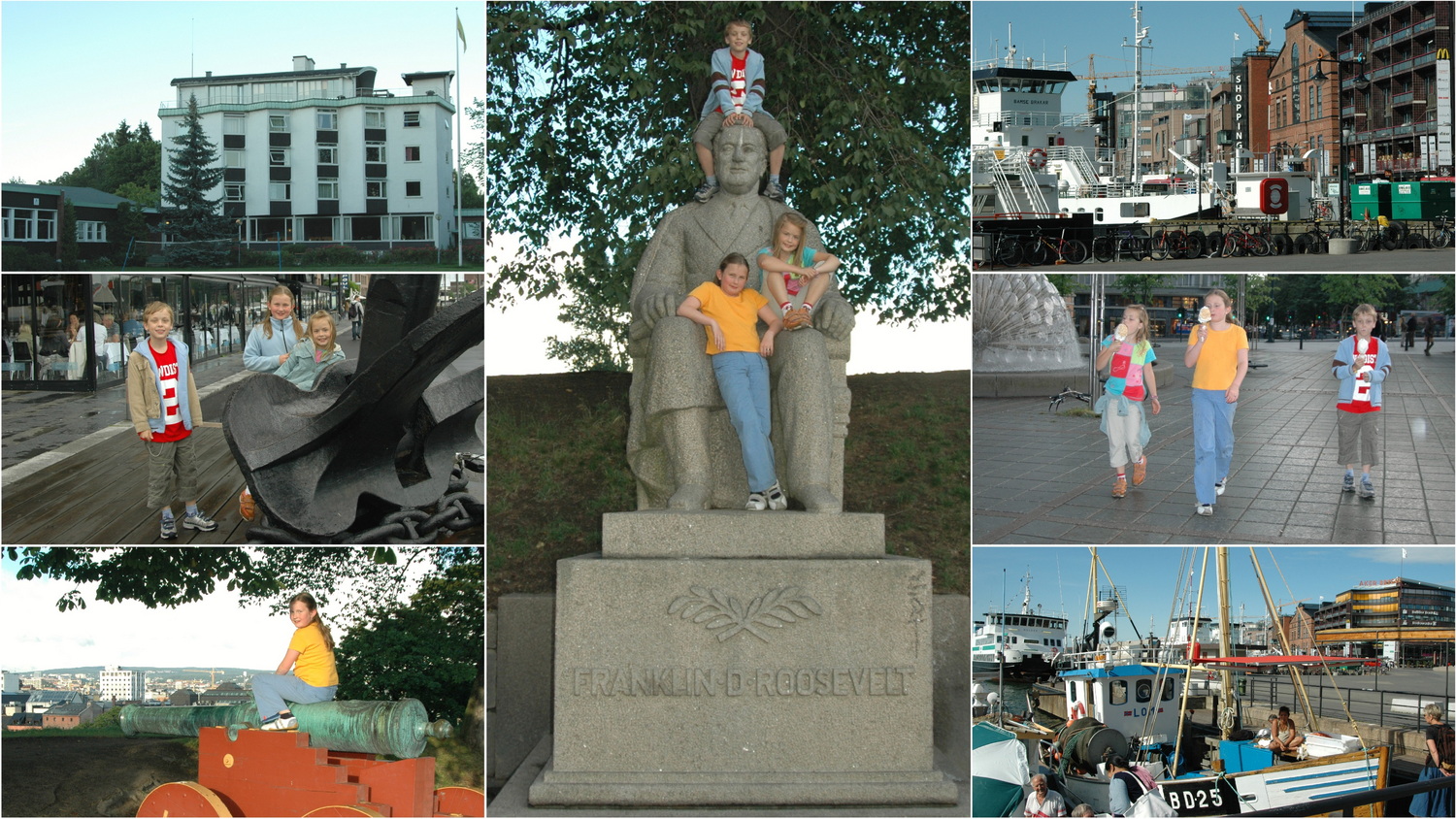 Wir checken ein und bekommen ein geräumiges Dreibettzimmer, in dem wir unser Zelt zum Trocknen aufhängen können. Wir melden uns telefonisch bei Familie Schröder, die ihren Norwegen- Trip mit ihren Kindern Lasse und Laura in Oslo beginnen. Lasse und Laura sind Annes Klassenkameraden in der Grundschule und wir treffen uns am Schiffsanleger hinter dem Rathaus. Von hier laufen wir entlang der Seaside von der Festung Akershus zur Aker Brygge und wieder zurück, wobei die Kinder sich ordentlich austoben. In der Klingenberggata am Rathaus gehen wir in der Pizzeria „Angelos“ zusammen essen. Zum Nachtisch gibt es noch ein Eis am Johanne Dybwads- Platz am Nationaltheater. Der Bus 151 bringt uns von der Frederiksgata zurück zur Jugendherberge nach Stabekk.