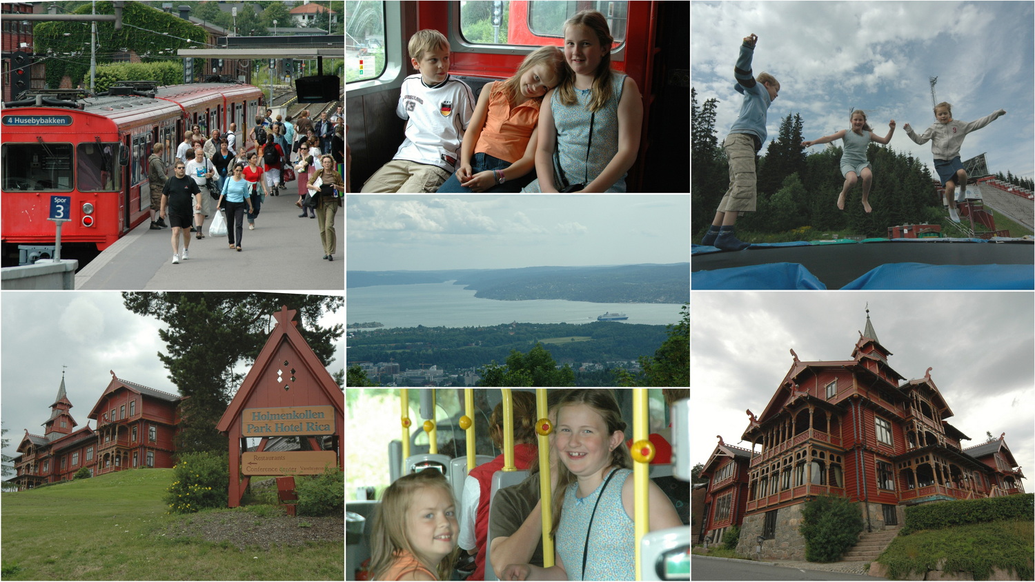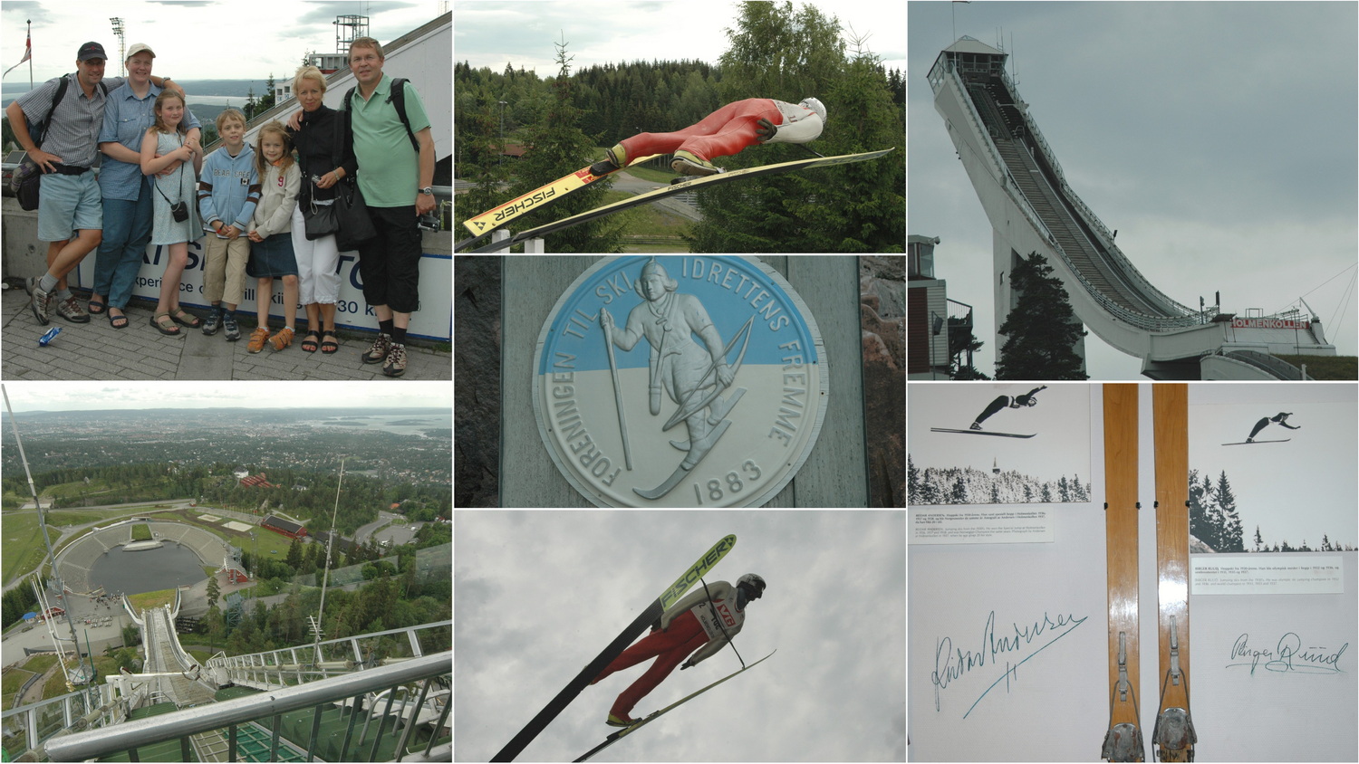 Mit der Buslinie 30 und 20 fahren wir am Vigeland Park vorbei ins Stadtviertel Majorstuen. Mit der Trambahn fahren wir von hier hinauf auf den Holmenkollen mit seiner Olympia- Skischanze und dem dazu gehörigen Museum. Von hier hat man einen herrlichen Blick hinunter auf die Stadt am Oslofjord. Namensgebend für den Berg oberhalb Oslos war Ende des 19. Jahrhunderts der Arzt Ingebrigt Holm, der hier zunächst ein Hotel und später ein Sanatorium unterhielt. Wir schauen uns das Museum an und gönnen uns einen Blick aus der Skifliegerperspektive oben vom Turm der Schanze. Hier runter fahren??- Das muss man wollen ;-). Unsere Kinder machen ihre eigenen Flugversuche auf einem Trampolin. Nach Erkundung der Anlagen kommen wir auch am historischen Holmenkollen- Hotel vorbei. Der Wunsch ist geboren, hier einmal zu wohnen und das machen wir 11 Jahre später zum Jahreswechsel 2017/18. Wir finden dann auch die neue futuristische Schanze vor, die im Jahr 2008 gebaut wird. Dazu habe ich den Bericht >Frühere Reisen/Norwegen/ Holmenkollen-Oslo 2017< geschrieben.