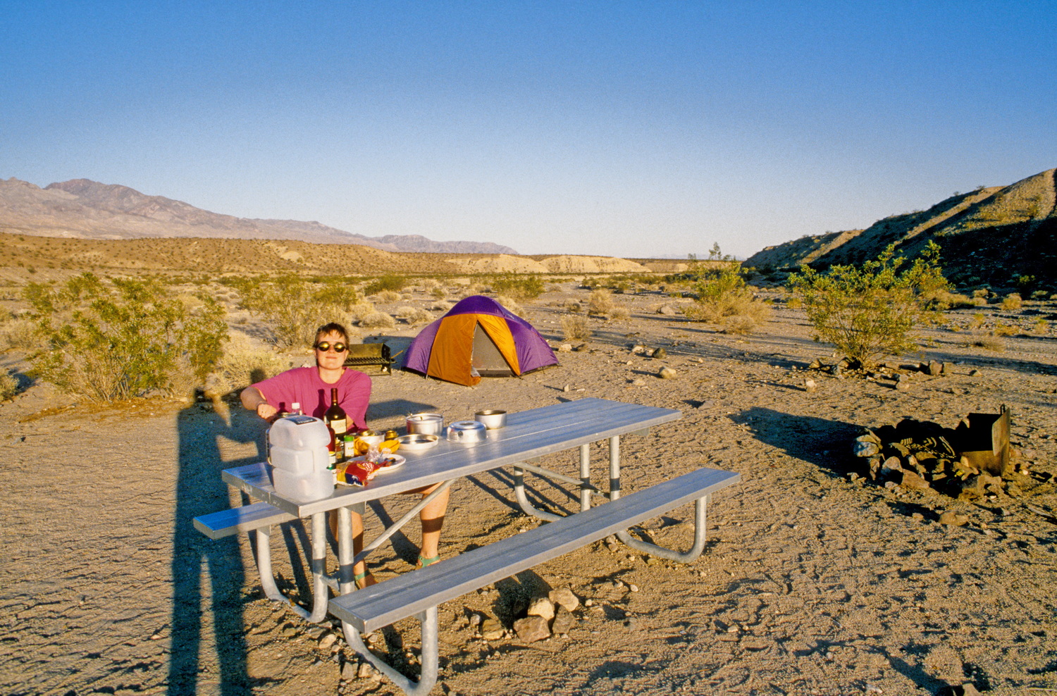 Um 17 Uhr fahren wir weiter zu Scottys Castle, der Prunkvilla eines Geschäftsmannes, aus der letztlich eine Touristenattraktion wurde. Nach dem großen Börsencrash von 1930 verblieb das kuriose Schloss im Status „Fast, aber nicht ganz“ fertig. Neben einem riesigen Pool gibt es einen Golfplatz mit Palmenhain mitten in der Wüste. Wir bauen unser Zelt auf dem Zeltplatz Mesquite-Spring auf und verbringen hier eine einsame Nacht auf dem weitläufigen Campground, wo in einiger Entfernung nur noch ein anderes Auto zu sehen ist. Wir erleben die Campingplätze auf unserer Tour oftmals als echtes Privileg, denn jede Parzelle ist geräumig, hat eine Picknick-Bank und eine Grill-Feuerstelle. Vor allen Dingen befindet man sich mitten in den großartigsten Naturparks und Landschaften der USA. Wir bereiten unser Abendessen während die Sonne untergeht und die Nacht hereinbricht.