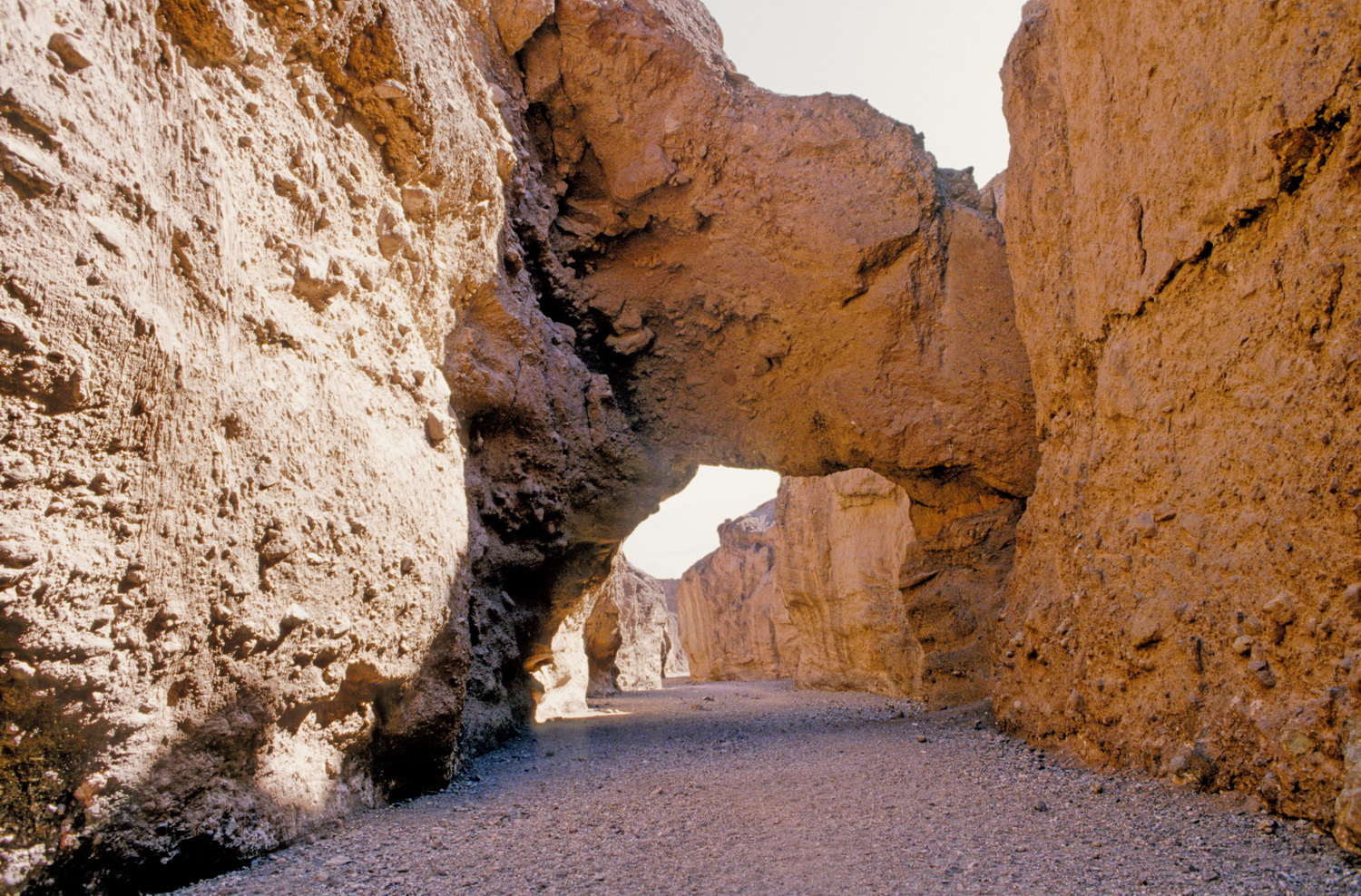 Mit einem extremeren Höhenunterschied befahren wir eine Schotterstraße durch den Twenty-Mule-Trail- Canyon hinauf zum 1670 Meter hohen Dantes- View, von wo wir nach Westen einen großartigen Ausblick auf den 3370 Meter hohen Teleskope- Peak und in weiter Ferne auf die schneebedeckte Sierra Nevada haben. Die gleiche Straße fahren wir zurück in den Talgrund und nehmen den Scenic- Drive in südlicher Richtung an der Artists- Palette vorbei, den durch Mineralien pastellfarben kolorierten Badlands. Als Devils Golf-Course wird ein Salzsee bezeichnet, dessen Salzkruste so uneben auskristallisiert ist, dass die Oberfläche kaum zu begehen ist. Ein Abstecher führt uns in den Natural-Bridge-Canyon, in dem sich stärkere Regenfälle schnell zu einer reißenden Flutwelle zwischen den steilen Felswänden sammeln können. Den tiefsten Punkt des nordamerikanischen Kontinents erreichen wir mit Minus- 86 Metern in Badwater.