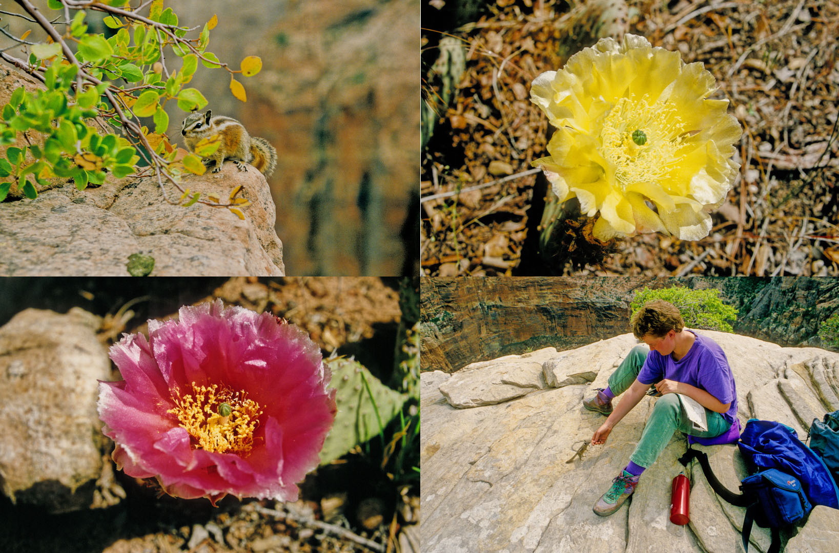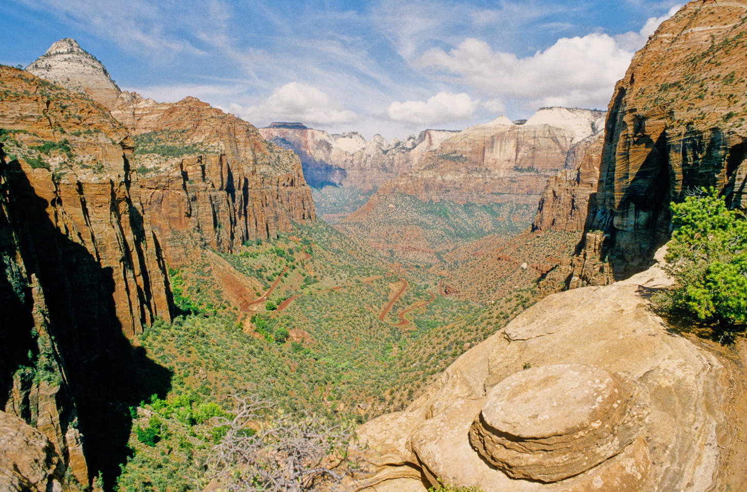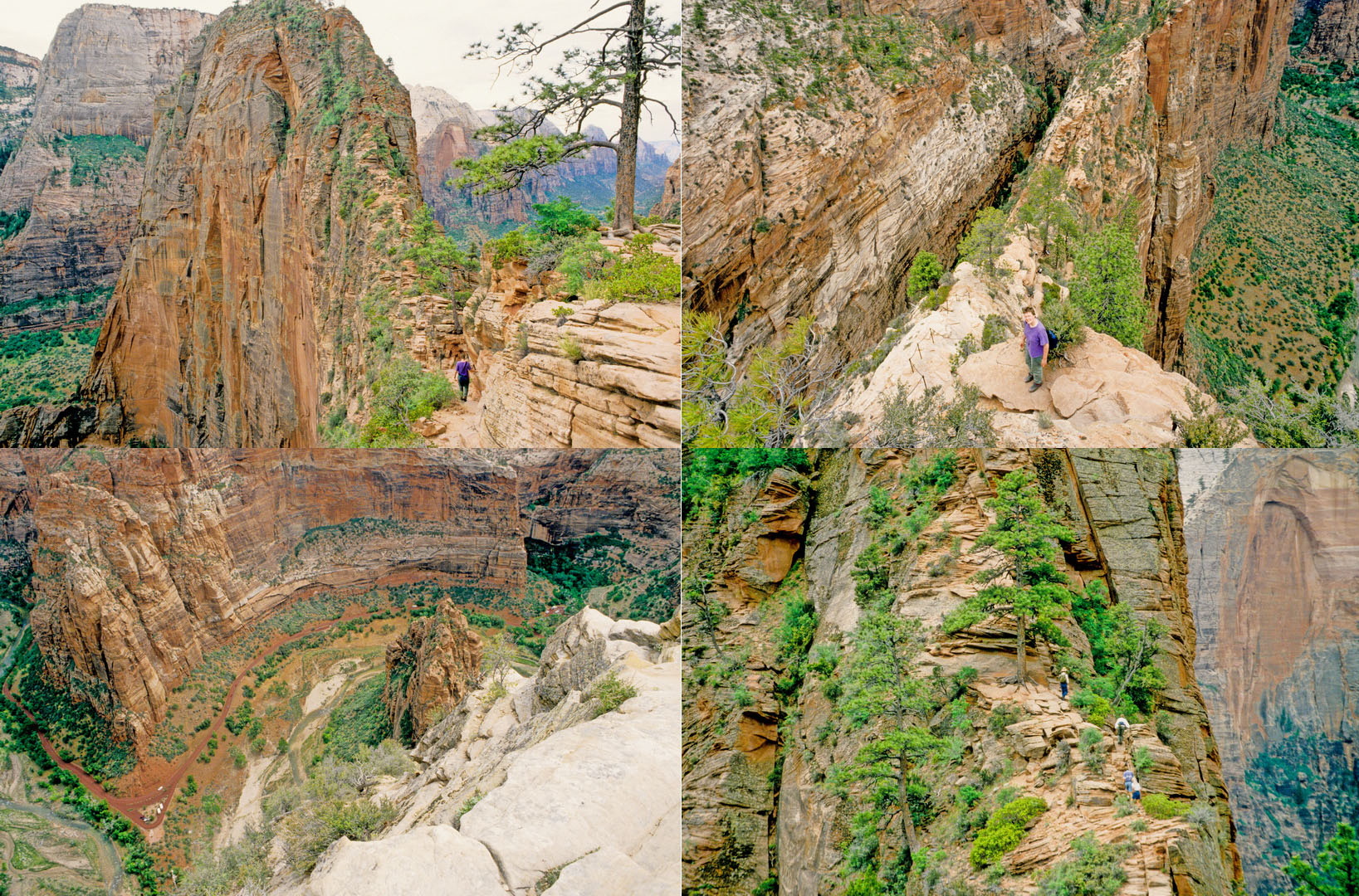 Am Mittwoch stehen wir gegen sieben Uhr auf und machen uns auf den Weg in den Zion-Canyon bis zum Picknickplatz „Grotto“, wo wir etwas frühstücken. Über den West-Rim-Trail laufen wir zum Einstieg von „Angels- Landing“. Die Landebahn der Engel ist eine exponierte Gratschulter, die auf das Gipfelplateau einer Canyon-Wand auf 1765 Meter hinaufführt. Die 200 Meter senkrecht in den Talgrund abfallenden Sandstein -Wände werden östlich von einer Flussschleife des Virgin- Rivers umflossen. Trittsicher sollte man unbedingt sein, denn der mit Ketten versicherte obere Bereich ist arg exponiert und die Tiefblicke nicht jedermanns Sache.