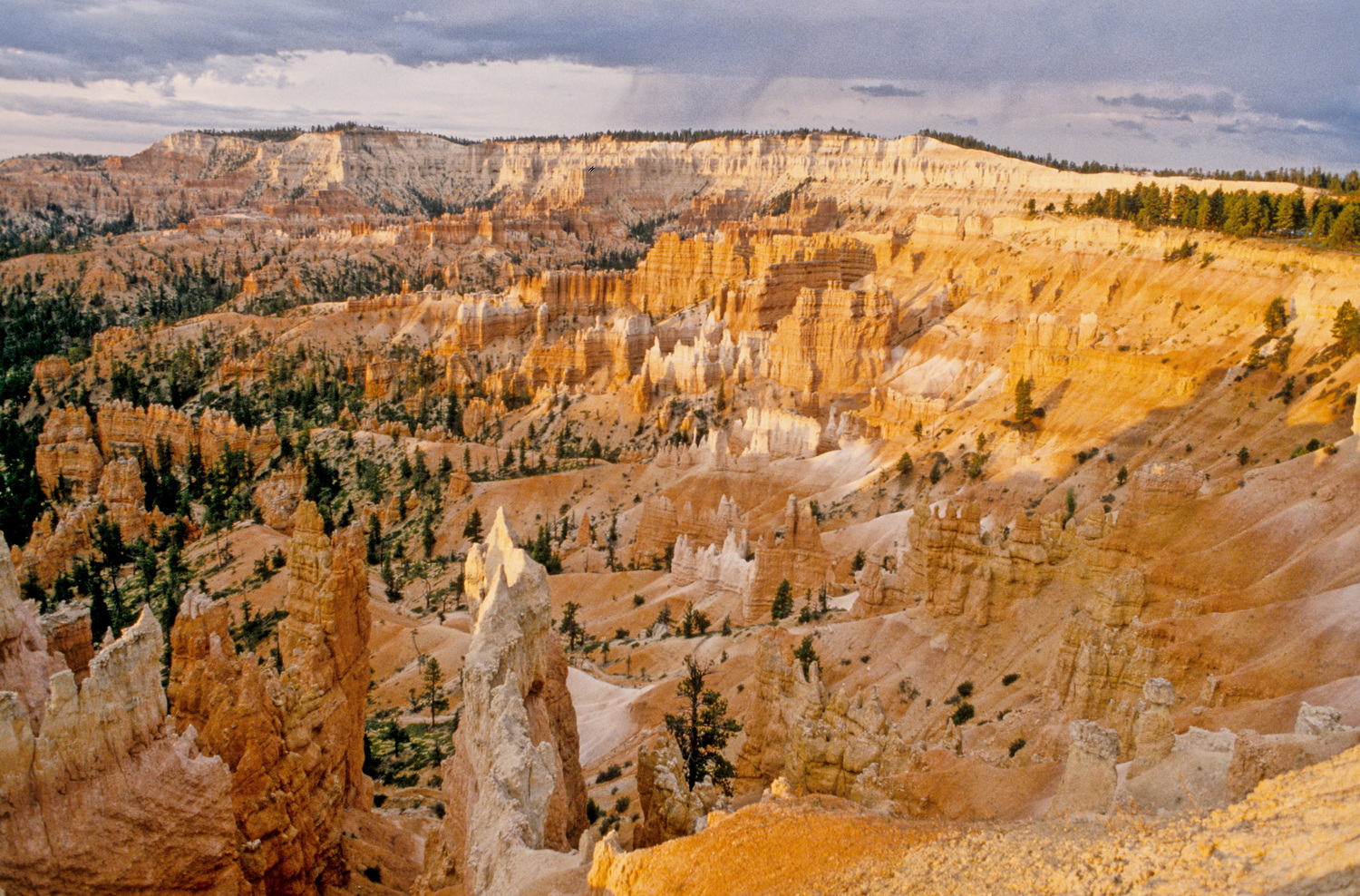 Unser Zelt stellen wir auf dem North-Campground auf und obwohl sich ein Gewitter ankündigt gehen wir zum Sunrise-Point am Amphitheater für einen ersten eindrucksvollen Rundblick über den Bryce-Canyon. Es ist recht frisch, denn wir befinden uns auf 2400 Höhenmetern. Von der Entstehungsgeschichte her handelt es sich hier nicht um einen echten Canyon, da die bizarren Felsformationen (Hoodoos) nicht durch einen Fluss entstanden sind. Wind, Wasser und Eis erodierten die Kante des Plateaus zu großen Amphitheatern aus unzähligen Felsnadeln, die eine Höhe von bis zu 60 Metern haben. Bryce Canyon ist mit einer Breite von 5- und einer Länge von 19 Kilometern das größte dieser Amphitheater, das über 240 Höhenmeter vom Plateau- Niveau abfällt. Wir duschen am Zeltplatz und waschen etwas Wäsche, nach dem Essen sitzen wir noch eine ganze Weile am Feuer vor dem Zelt.