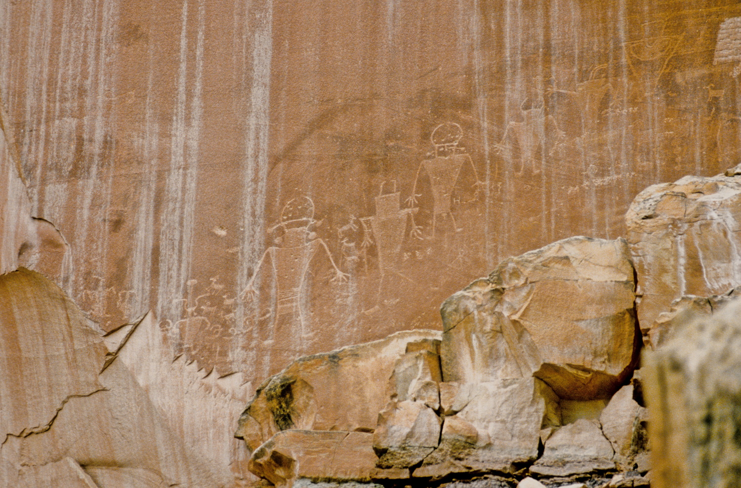 Wir fahren auf dem Scenic-Drive weiter in südlicher Richtung. In der Gegend wurde bis 1904 Uran für fragliche medizinische Anwendungen abgebaut. Wir biegen in den Capitol-Gorge ein, durch den bis 1961 die alte NP-Straße führte. Auf ihrem Weg nach Westen nutzten auch die Pioniere Amerikas diese Schlucht und hinterließen seit 1800 an einer Wand namens „Register“ ihre eingeritzten Namen. Über 1000 Jahre alt sind dagegen die Petroglyphen der Ureinwohner aus der Fremont- Kultur. Den Besuch altgenutzter Naturzisternen unterlassen wir, da wieder ein Gewitter heranzieht. Bei ergiebigem Regen befänden wir uns im Canyon-Grund nicht unbedingt auf idealem Terrain.