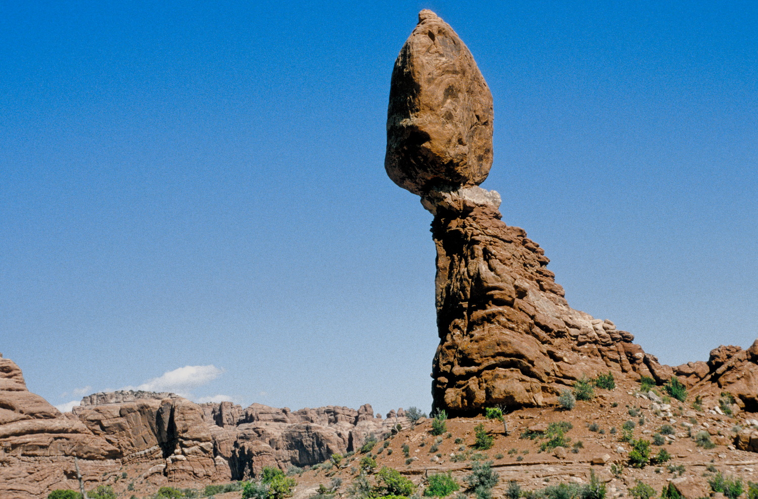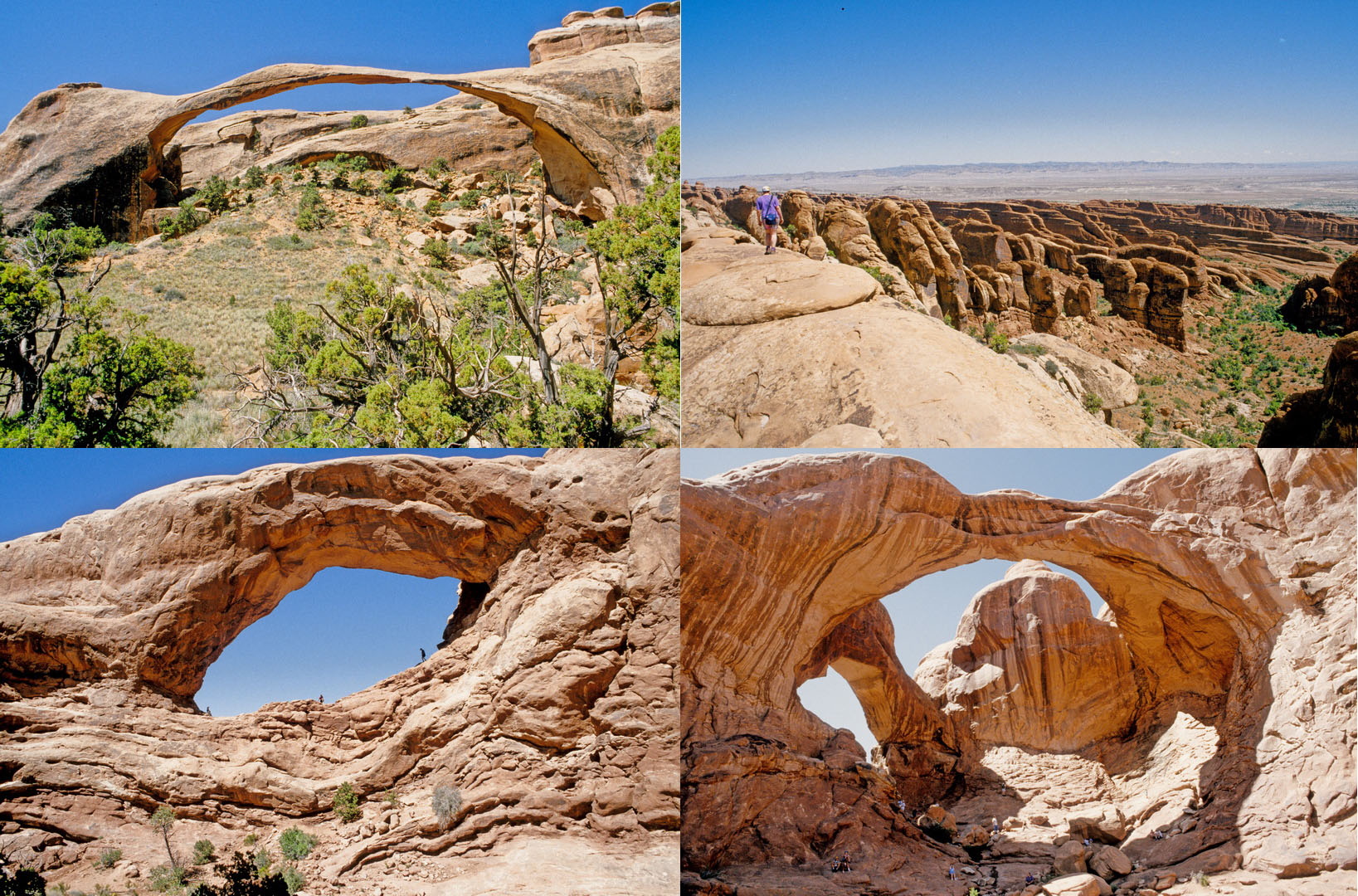 Es ist recht heiß und zunächst machen wir eine lange Trinkpause, bevor wir uns nun mit dem Auto in südlicher Richtung am Skyline-Arch vorbei zum Parkplatz an den Sand-Dunes begeben, wo wir ein Stück zum Sand-Dune- Arch hinauflaufen. Ich gehe noch ein Stück weiter zum Broken-Arch und kehre dann auch zurück zum Parkplatz. Wir fahren nun zum Fiery-Furnance- View-Point und weiter am Panorama-Point vorbei zur südlichen Windows-Section des Parks. Auf der einen Seite der Straße sehen wir uns den Double-Arch an, bevor wir uns auf der anderen Seite die benachbarten North- und South-Windows und den Turret-Arch erlaufen. Ein Stück weiter nach Süden liegt an der Straße die Felsformation „Balanced Rock“, wo ein riesiger Felsen auf einer Felsspitze der Schwerkraft trotzt.