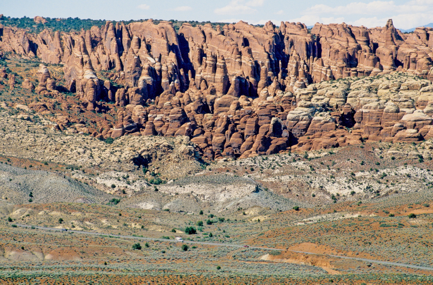Der Sonntag beginnt um 6:30 Uhr und wir frühstücken ausgiebig im Motel, bevor wir uns wieder auf der Interstate 70 einfädeln und die Utah 191 über Moab zum Parkeingang im Süden des Arches-NP nehmen. Zum Campground am Devils-Garden fahren wir die Parkstraße 18 Meilen nach Norden und sind überrascht wie voll es hier bereits um 9:00 Uhr morgens ist. Normalerweise registriert man sich selbst und wirft den Betrag in einen Kasten, hier werden die Permits zugeteilt. Wir ergattern die letzte Parzelle und bauen unser Zelt auf. Es ist früh am Tag und als erste Unternehmung im Arches nehmen wir den 2,5 Kilometer langen Devils-Garden- Trail in Angriff.