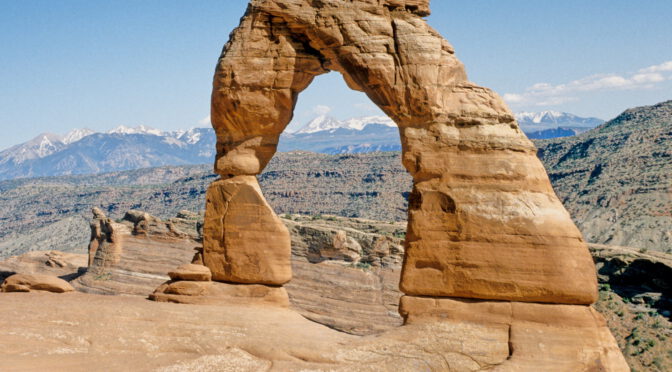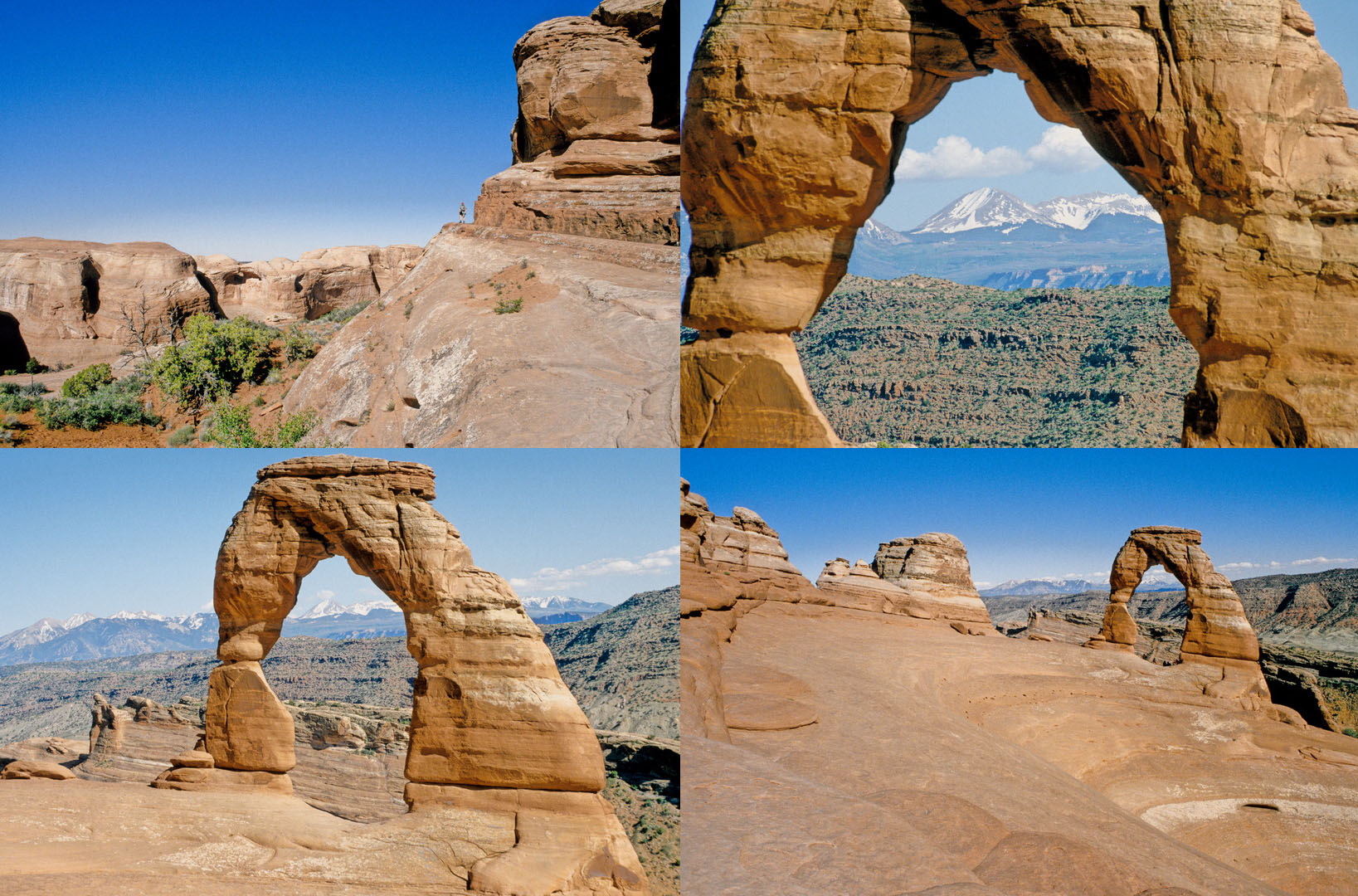 Über den Panorama-Point fahren wir zurück nach Norden und zweigen ab zur Wolfe-Ranch. Von hier führt ein 2,4 Kilometer langer Trail zum Wahrzeichen des Parks, dem eleganten „Delicate-Arch“. Obwohl sich die Nachmittagssonne langsam absenkt brennt sie immer noch ohne Erbarmen vom Himmel, während wir über die Slick-Rocks laufen. Erst nach der Einbiegung über ein Felsband öffnet sich der Blick auf den formschönen Bogen, hinter dem sich die schneebedeckten Gipfel des La Sal- Gebirges zeigen. Diesen Eindruck lassen wir eine Weile auf den warmen Felsplatten liegend auf uns wirken bevor wir zum Auto und zum Camp zurückkehren. Wir machen ein Lagerfeuer, grillen Kartoffeln und Zwiebeln, schreiben Karten nach Hause und bestaunen den Sonnenuntergang bis die Sterne über uns funkeln.