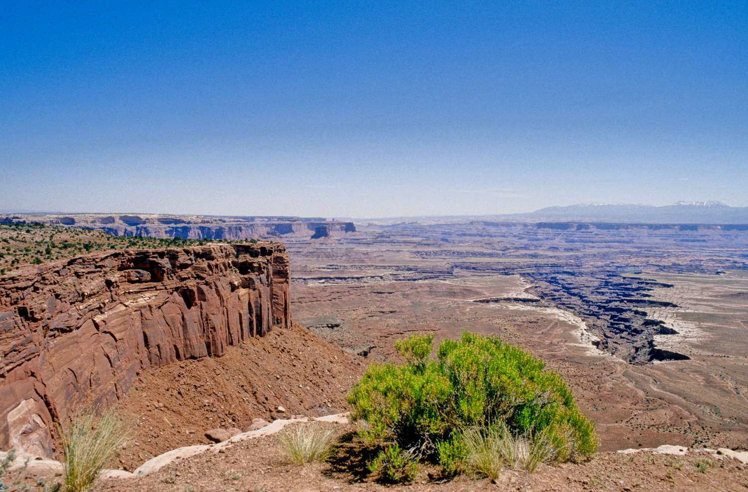 Im Canyonlands-NP erarbeiten wir uns den nördlichen „Island in the Sky“ genannten Teil ausschließlich mit dem Auto. Ein Besuch der Parkbereiche im Südosten „The Needles“ und im Westen „The Maze“ und „Horseshoe“ passen leider nicht mehr in unsere Zeitplanung. Wir blicken von den Viewpoints in die weite, von tiefen Canyons zerteilte Ebene. Es ist das Colorado-Plateau, in das sich Colorado und Green-River im Laufe der Erdgeschichte eingegraben haben. Allein die Fläche dieses Parks erstreckt sich auf 1366 Quadratkilometer und der Blick in die unendlich erscheinende Weite lässt uns klein und demütig werden. Weit weg am Horizont blicken wir wieder auf die Gipfel der La Sal- Mountains mit ihrer höchsten Erhebung, dem Mount Peale 3877m.