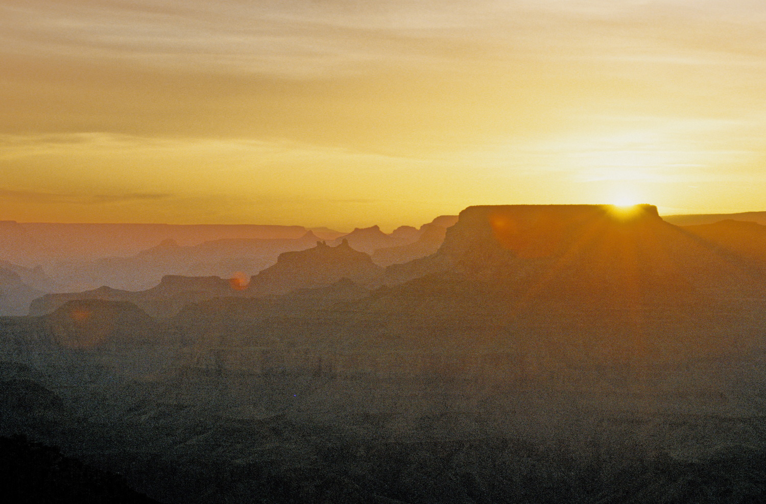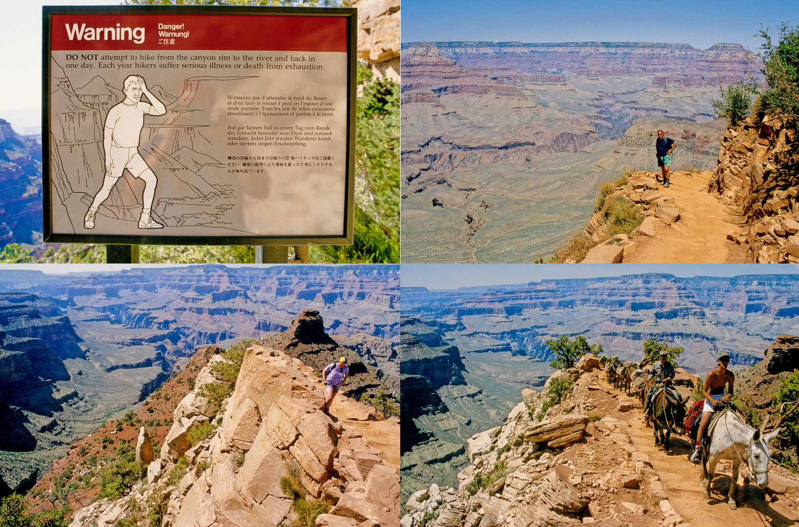 Hier steigen wir nun über einen Teil des Kaibab-Trails bis zur Cedar-Ridge, dem Maultier- Anlegeplatz ab. Wir holen uns damit zu Fuß einen Eindruck über die Dimensionen dieses Canyons. Es sind nur 360 Höhenmeter, die wir in den nachmittäglichen Glutofen der Schlucht absteigen und auf denen wir zusammen 3,5 Liter Wasser mitführen. Schon die knapp 5 Kilometer runter und wieder rauf sind nicht zu unterschätzen, denn letztlich ist es der Aufstieg zurück zur Rim-Kante, der den Schweiß tropfen lässt. Es überschätzen sich immer wieder Wanderer, die in Not geraten oder gar zu Tode kommen in dem Gelände, in dem es kein Wasser und keinen Schatten gibt. Im Aufstieg werden die Schatten im Canyon breiter und die Sonne kleidet alles in immer wärmere Farben als wir mit leeren Wasserflaschen den Einstieg an der Rim-Kante erreichen.