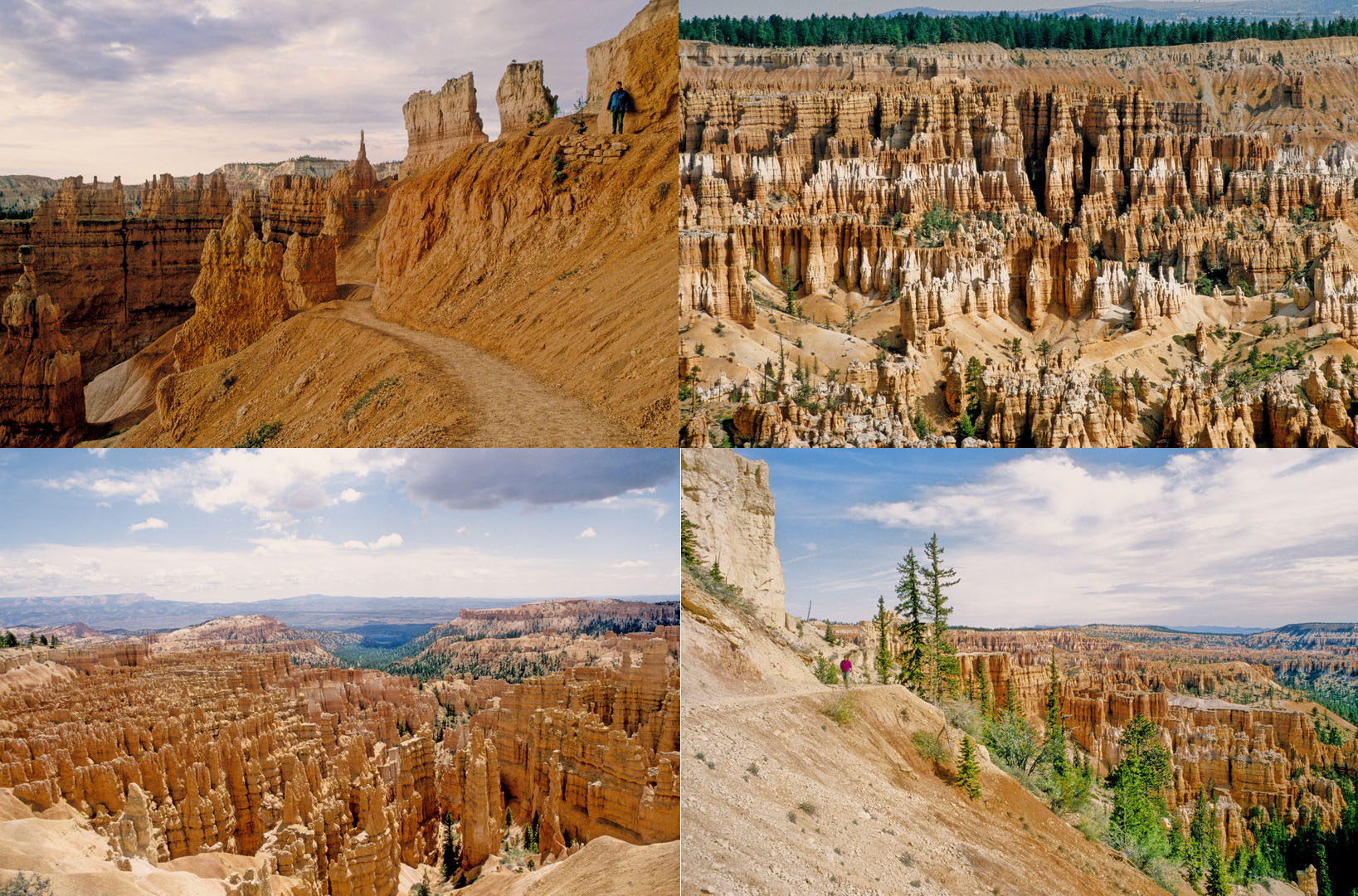Am Abend essen wir in Springdale am südlichen Parkeingang und kehren danach müde zu unserem Zelt zurück. Am Donnerstagmorgen bauen wir das noch etwas nasse Zelt ab. Wir verlassen Zion über den Zion-Mount Carmel- Highway, eine Bergstrecke, die nördlich des Visitor- Centers nach Osten abzweigt und uns durch einen langen Tunnel zum Canyon Overlook auf 1562m hinaufführt. Die Sonne lässt das Zion-Tal erstrahlen, Kakteenblüten in sattem Rot und Gelb öffnen ihre Blüten. Über die Utah 9 und die Utah 89 Nord zweigen wir auf die Utah 12 ab und fahren durch den Red Canyon auf den Bryce Canyon-NP zu. Bevor wir in den Park einfahren gehen wir noch etwas einkaufen.