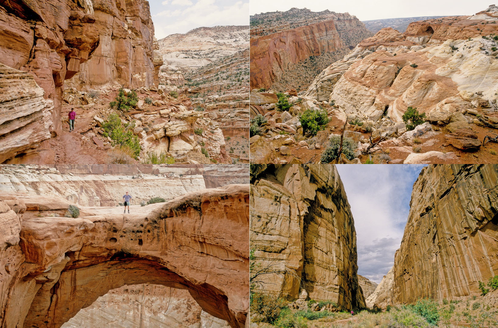 Mir geht es am Samstagmorgen wieder gut und nach dem Frühstück vor dem Zeltabbau sind wir schon vor neun „On the Road“ auf der Utah 12. Im Dixie- National-Forest überwinden wir eine Höhe von 3000 Metern, bevor wir Torrey erreichen. Über die Utah 24 fahren wir in den Capitol-Reef- NP ein. Wir stoppen am Goosenecks- Overlook mit Blick in den Canyon des Sulphier-Creeks. Im Visitor-Center besorgen wir uns die obligatorische NP-Karte und fahren über einen Abzweig in den „Grand Wash“ ein. Von hier führt ein Trail zu einem Felsbogen mit dem Namen „Cassidy-Arch“. Angeblich soll sich hier die Bande des gesetzlosen Butch Cassidy versteckt haben, was man sich gut vorstellen kann. Trotz Gewitterstimmung ist es eine tolle Wanderung von der wir nach gut drei Stunden trocken zum Ausgangspunkt zurückkehren.