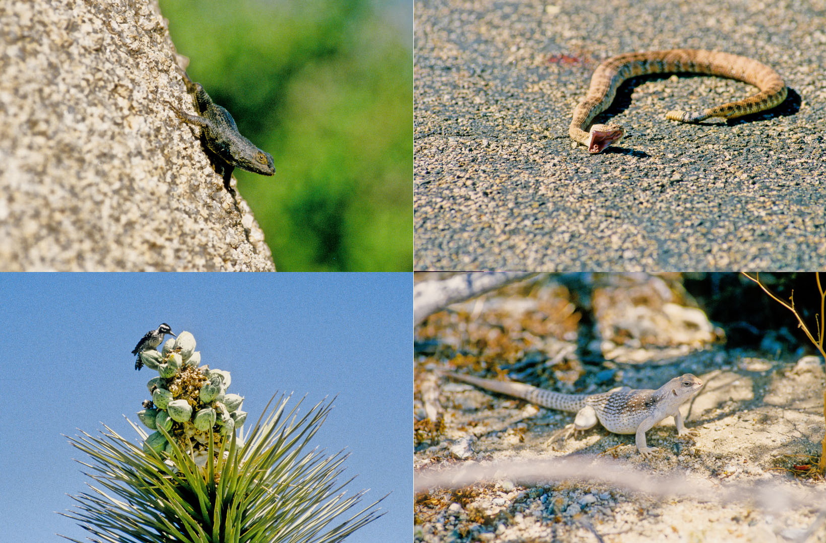 Am Samstag frühstücken wir auf unserer Parzelle neben einem der Felsen, die dem Campground den Namen geben. Wir beobachten Echsen und Vögel, die uns Gesellschaft leisten. Auch in der letzten Nacht hat ein Tier an unserem Zelt herumgeschnüffelt. Wir bauen unser Lager ab und verschaffen uns einen Überblick über das Gelände vom Keys-View 1576m. Der Joshua-Tree- NP bildet die südliche Grenze der Mojave Wüste. Direkt in der Nähe unseres Zeltplatzes haben wir am Morgen auf der Straße eine leider überfahrene Sidewinder- Klapperschlange gesehen. Verletzt und im hinteren Teil unbeweglich öffnet sie ihr Maul, in dem die tödlichen Giftzähne erkennbar sind. Ein anderer Beobachter rät mir beim Fotografieren nicht zu nah heranzugehen. Der Beißreflex der Schlange sei auch im Todeskampf noch gut ausgeprägt.