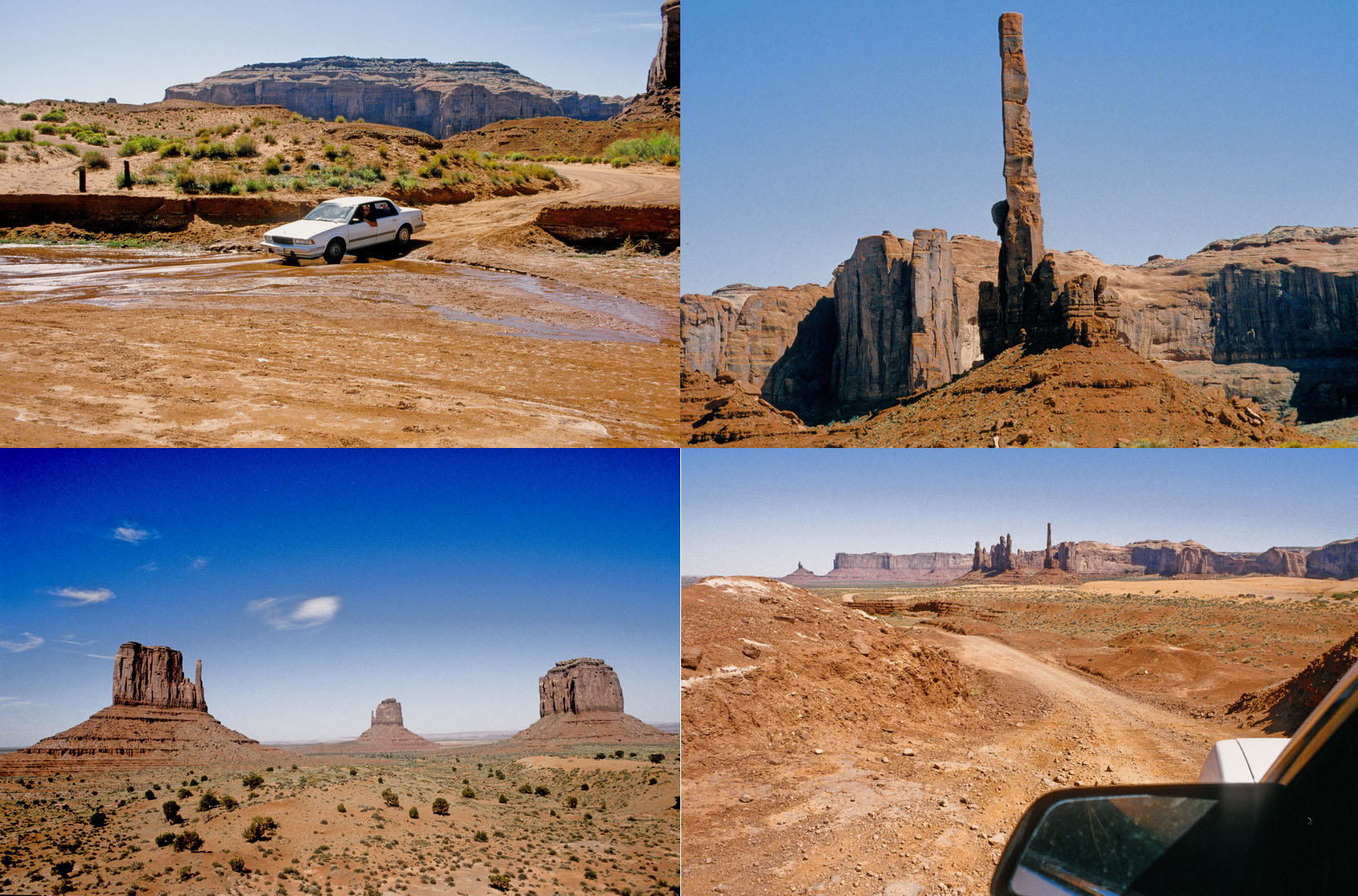Am Sliding-House- und White-House- Overlook vorbei schauen wir uns vom Junction- Overlook den Sonnenuntergang an. Wir fahren zurück zum Abendessen in unser Motel, das diesmal mit 96 Dollar zu Buche schlägt. Mittwoch ist der erste Tag im Juni, wir sind bereits um 6:30 Uhr beim Frühstück und danach zeitig unterwegs zurück über die 191 Nord nach Bluff in Utah. Von hier geht es über die 163 West bis zu einem Abzweig auf eine Schotterpiste durch das „Valley of the Gods“. Nun sind wir inmitten der Prärie mit den ersten Tafelbergen, einer Landschaft wie wir sie aus Wild-West- Filmen kennen.