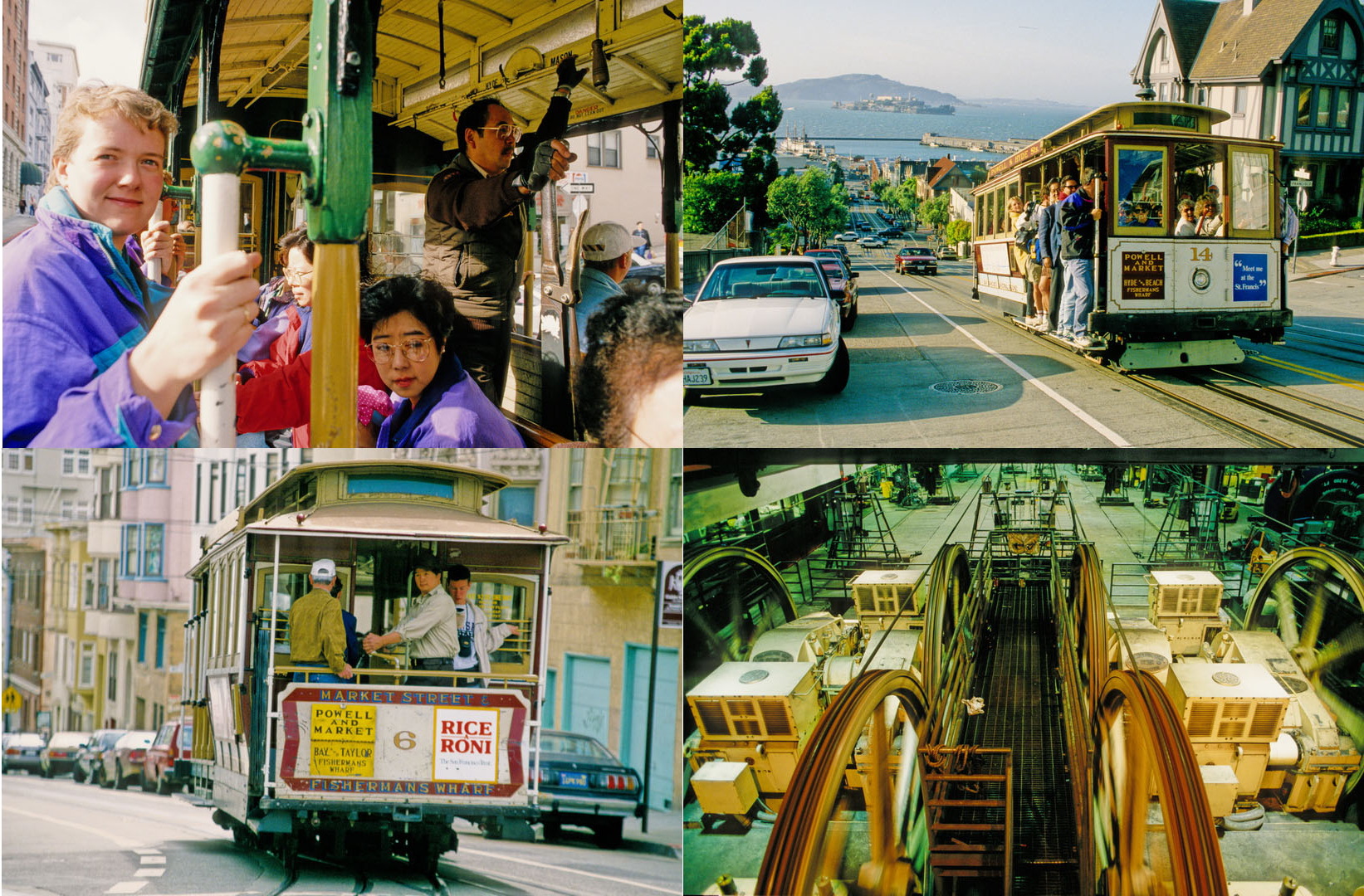 Am Nachmittag laufen wir die Van Ness Ave. hinunter bis zur Bay und weiter auf den Municipal Pier. Am Fishermans Wharf vorbei folgen wir der Hide- Street hinauf und kaufen Tickets für Cable- Car, die legendäre Straßenbahn, die seit 1873 von angetriebenen Drahtseilen unter der Straße gezogen wird. Nach dem Erdbeben von 1906 blieben nur noch die steilsten Strecken und nur durch ein Bürgerbegehren von 1947 bis heute die letzten beiden Linien erhalten. Heute ist Cable- Car ein Wahrzeichen und nicht mehr wegzudenken aus der Metropole mit den steilen Straßen.
