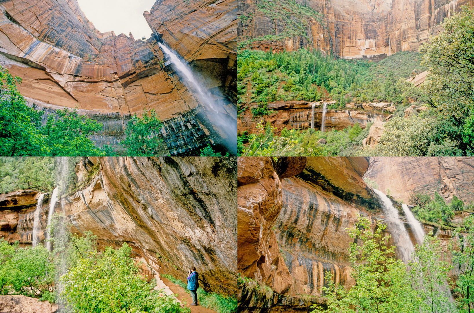 Den Regen lassen wir bei einer informativen Diashow über den Zion-NP im Visitor-Center draußen, bis er zumindest weniger wird. Wir fahren weiter nördlich zu einem Punkt, der sich „Temple of Sinawava“ nennt. Hier blickt man auf ein natürliches Amphitheater aus senkrechten roten Sandsteinwänden. Wir gehen von hier den „Gateway to the Narrows-Trail“ bis zu dem Punkt, an dem man den Canyongrund nur noch durchs Wasser begehen kann. Danach fahren wir zurück zur Zion-Lodge 1303m, von wo aus wir zum oberen Emerald- Pool aufsteigen. Wasser stürzt von einer hohen Felswand und füllt einen oberen Pool, von dem sich weitere Wasserfälle über Felskanten ergießen, die den mittleren und unteren Pool füllen. Der Rückweg führt teilweise hinter diesen Wasserfällen entlang.