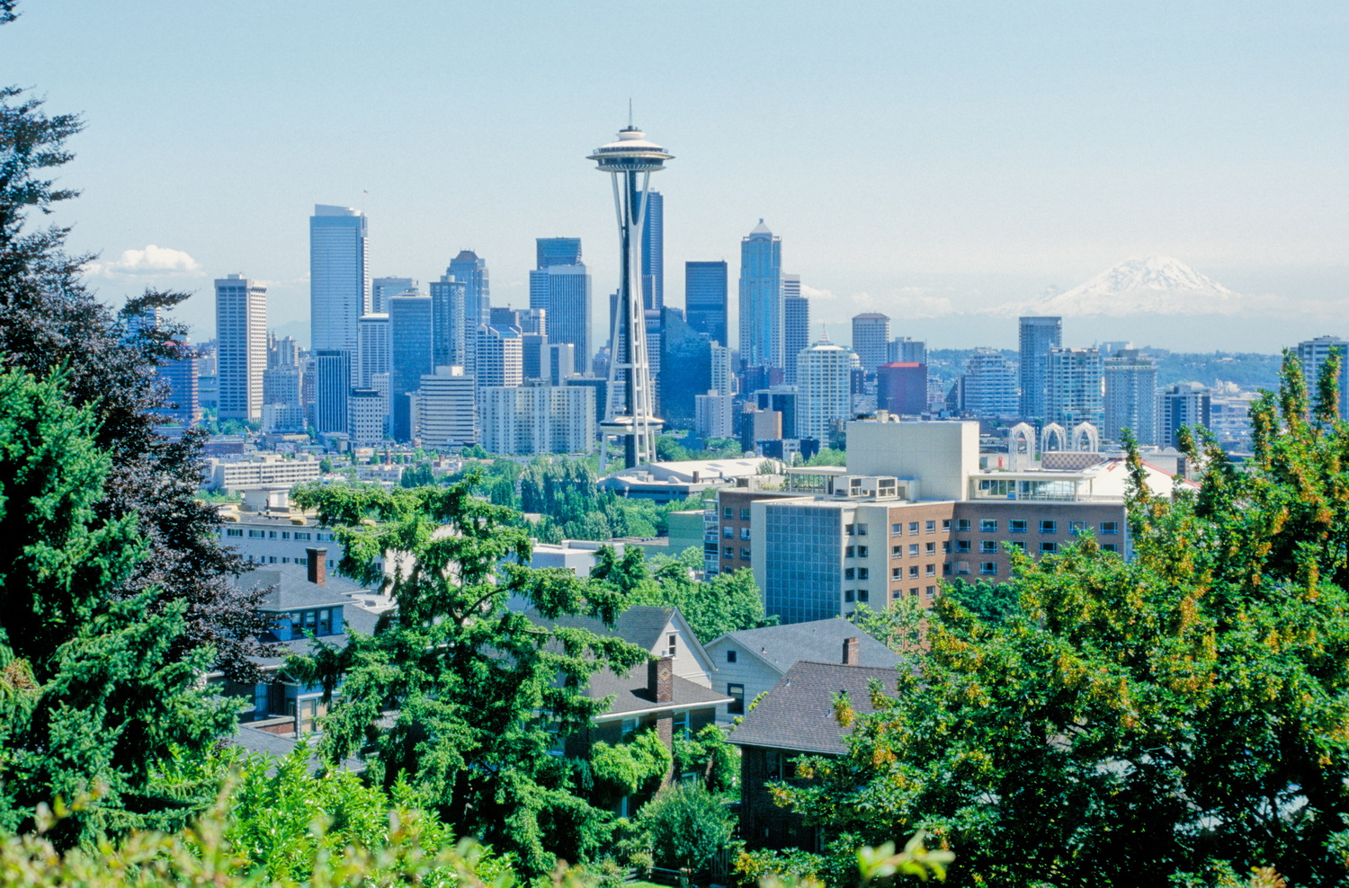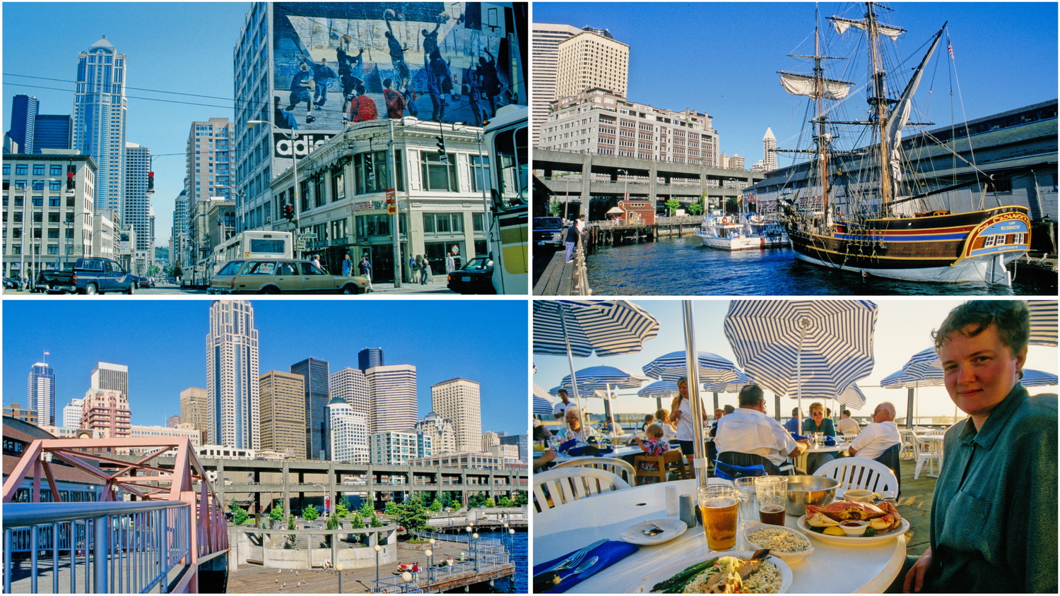 Über die Interstate 5 fahren wir vom Flughafen Tacoma nach Seattle zum gebuchten Hilton-Downtown- Hotel. Das Zimmer ist noch nicht bezugsfertig und so fahren wir erst einmal zum Kinnear- Park. Hier haben wir einen schönen Blick nach Südost auf die Seattle Space Needle vor der Kulisse des 4392 Meter hohen, vergletscherten Vulkans Mount Rainier. Nordöstlich der Space- Needle essen wir am Yachthafen am Lake Union Fish & Chips und kehren dann zum Hotel zurück. Von unserem Zimmer im 20. Stock blicken wir nach Westen über den Puget- Sound auf die Olympic- Mountains. Noch nicht müde genug ziehen wir am Nachmittag noch einmal zu Fuß los zu den Piers an der Eliott- Bay. Hier besuchen wir das Seattle- Aquarium und die Markthallen am Pikes-Place. Beeindruckend sind hier die kapitalen Lachse in der Fischhalle.