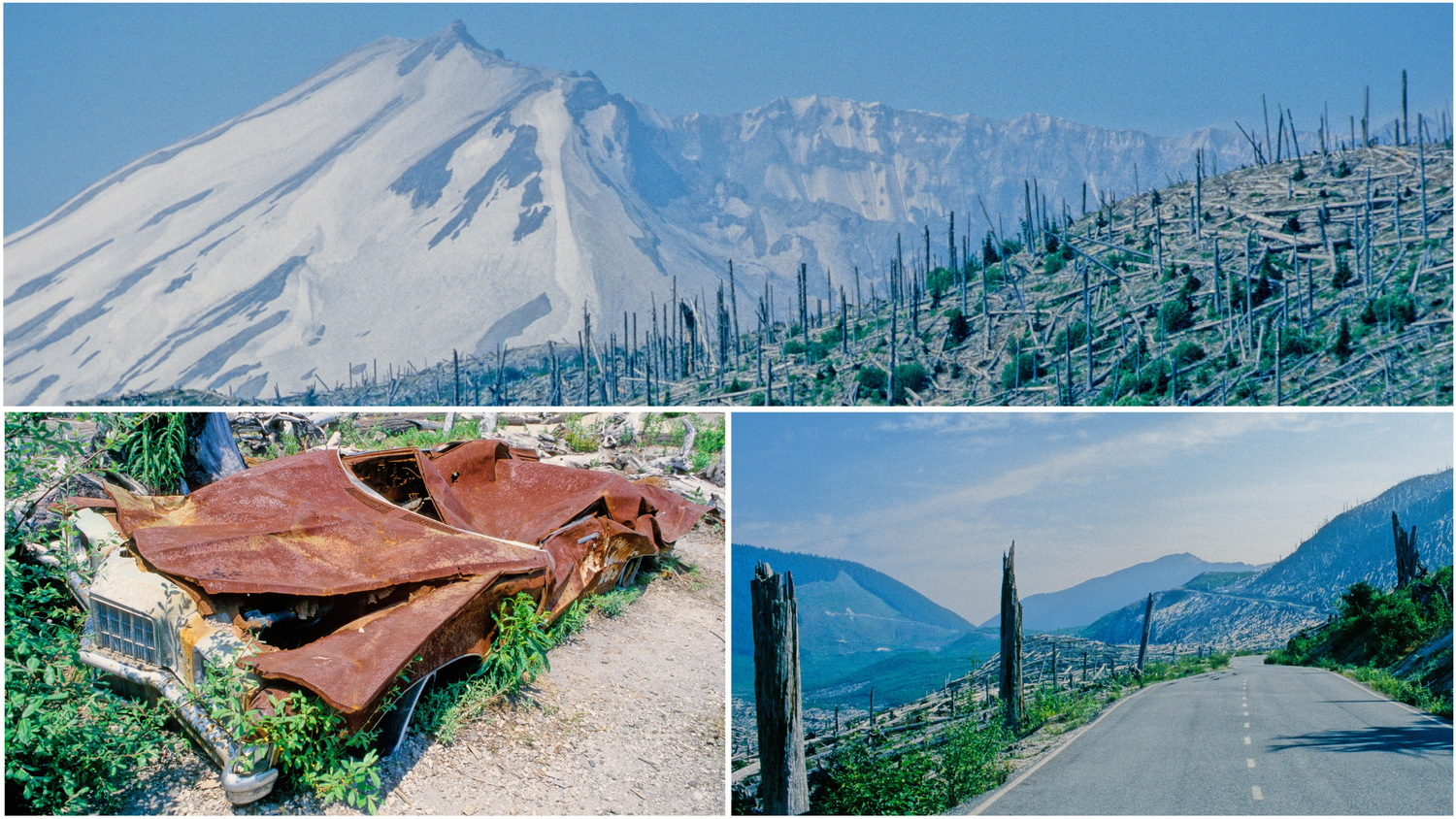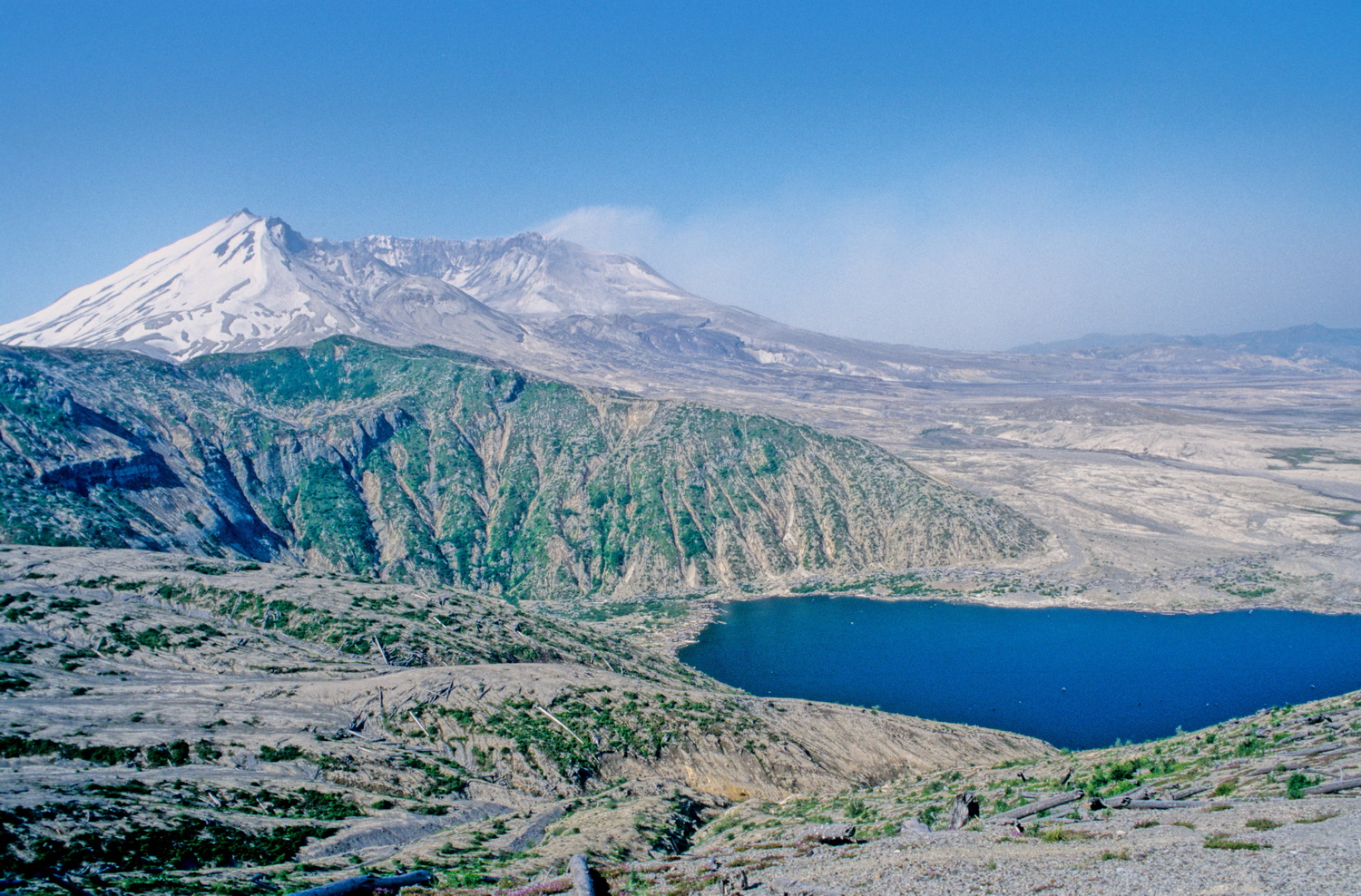 Wir fahren die Straße bis zum Windy Creek hinauf, von wo wir einen guten Blick auf den Berg haben. Ein Treppenweg führt auf einen Hügel, von dem uns das enorme Ausmaß der Verwüstung der ehemals idyllischen Landschaft auch nach 15 Jahren noch sehr beeindruckend erscheint. Ein Teil des Spirit Lakes ist bedeckt von den fahlen Stämmen des ehemaligen Waldes, der den See einst eingerahmt hat. Ein Stück an der Straße zurück lassen wir das Auto stehen und machen uns an den Harmony-Trail, der uns in 20 Minuten an das Seeufer bringt. Alles wirkt postapokalyptisch wie nach der Zündung einer Atombombe. Wiederum ein Stück unterhalb an der Straße führt uns der Independence- Trail in etwa 45 Minuten zu einem weiteren View-Point. Auf dem Berg und auch im Krater auf dem Lava-Dome liegt noch Schnee. Der Vulkan schläft seit 1986, nach einer erneuten Phase seismischer Aktivität gab es am 1. Oktober 2004 noch einen kleineren Ausbruch.