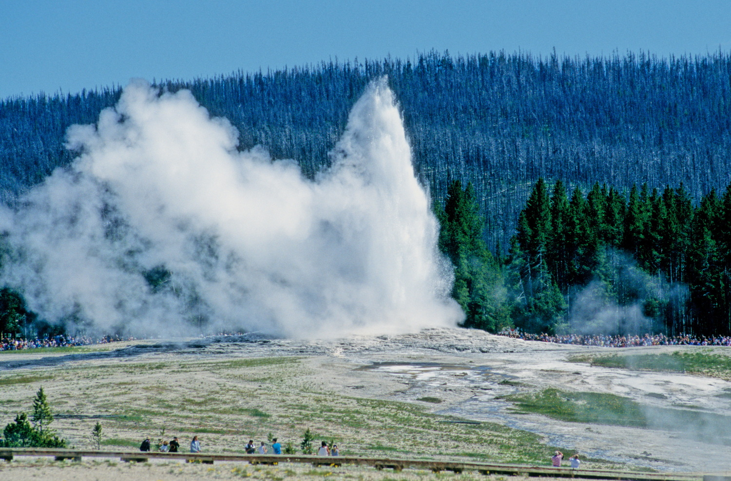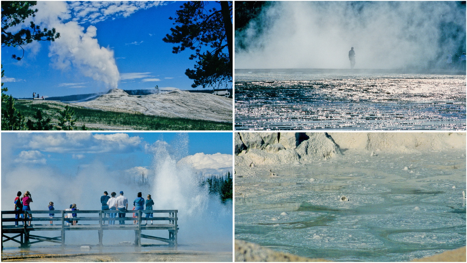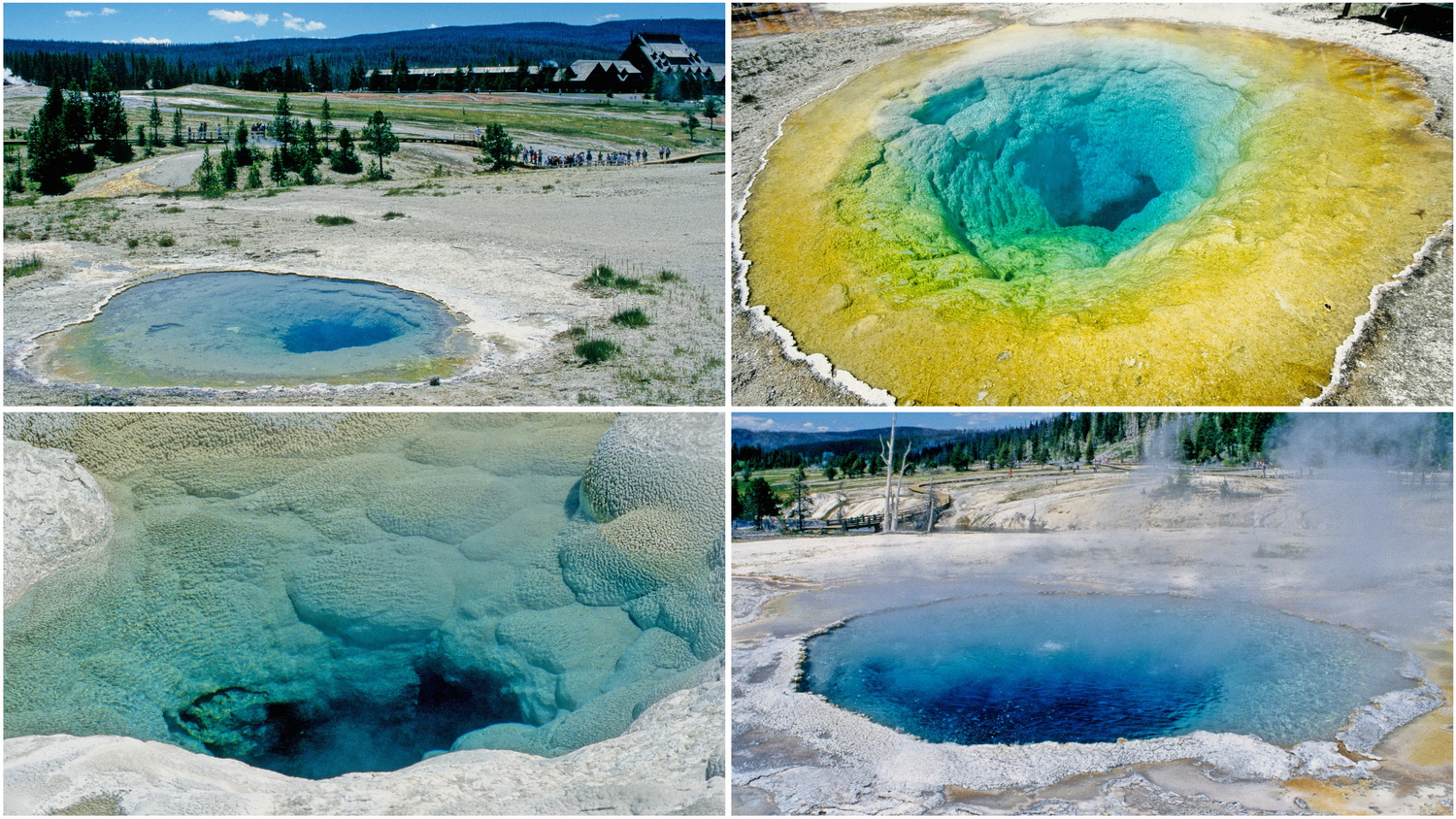 Die vulkanogene Landschaft Yellowstones tritt in Form von 500 Geysiren und etwa 10000 heißen Quellen zu Tage, was über 62 Prozent aller weltweit vorkommenden heißen Quellen entspricht. Andere geothermale Erscheinungsformen sind die unzähligen Fumarolen und Schlammtöpfe, die durchaus Gefahren beim Betreten des Geländes außerhalb der Bohlenwege darstellen. Nachdem wir Zeugen der für 12:50 Uhr vorhergesagten Eruption von Old Faithful geworden sind, gehen wir den Trail durch das Upper Basin. Beauty Pool und Glory Morning Pool sind heiße Quelltöpfe, die in wunderbaren Farben erstrahlen. Es sind thermophile Algen und Bakterien, die den Becken ihre Farben verleihen und um deren Erforschung und Nutzung sich Bio-Tech- Unternehmen rangeln. Das Patent auf ein isoliertes Enzym aus „Thermus aquaticus“, einer Taq-Polymerase zum Einsatz in der Gentechnik hat dem Schweizer Unternehmen Roche Einnahmen in Milliardenhöhe eingebracht. So hat man auch entdeckt, dass spezielle Cyano- Algen giftiges Arsen aus der Umwelt binden können, womit zum Beispiel Arsen aus Trinkwasser extrahiert werden kann.