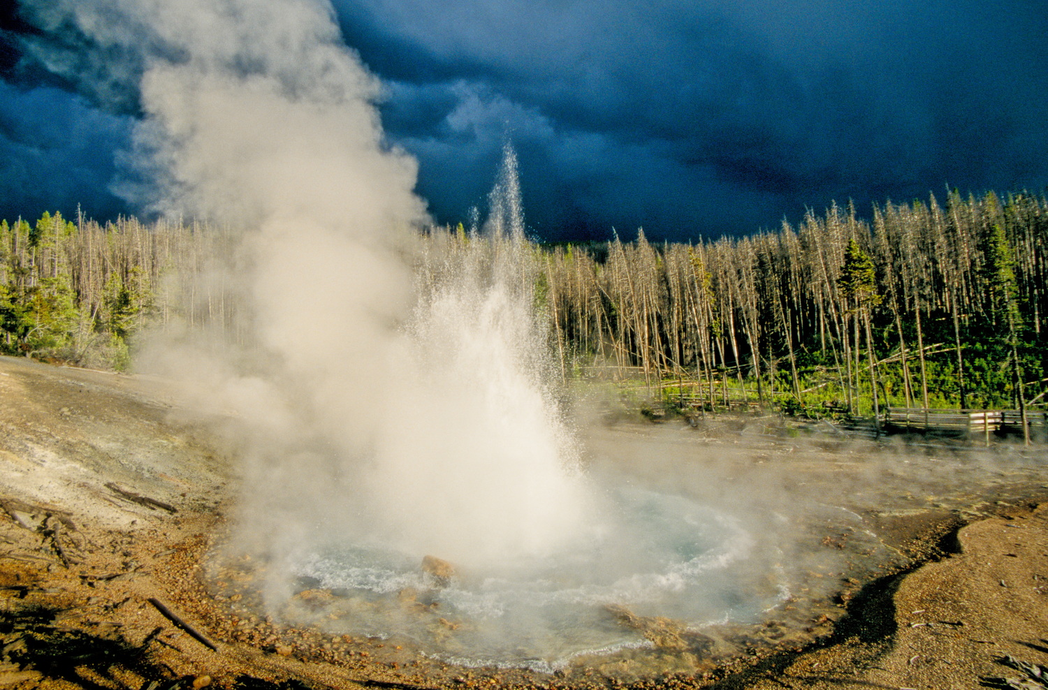 Yellowstones Nationalpark- Fläche von 8987 Quadratkilometern liegt zu 96 Prozent in Wyoming, wobei im westlichen Teil 3 Prozent in Montana und 1 Prozent in Idaho liegen. Hier im Gebiet der Rocky Mountains liegt der Park auf einer durchschnittlichen Höhe von 2440 Metern. Der höchste Punkt ist der Eagle Peak mit 3462 Metern. Weite Teile des Gebietes befinden sich in der Caldera eines Supervulkans mit einer in 8 Kilometern Tiefe liegenden Magmakammer, die eine Ausdehnung von 80 x 40 Kilometern bei einer Mächtigkeit von 10 Kilometern hat. Supervulkane haben bei einem Ausbruch das Potenzial für globale Auswirkungen auf das Leben auf unserem Planeten.