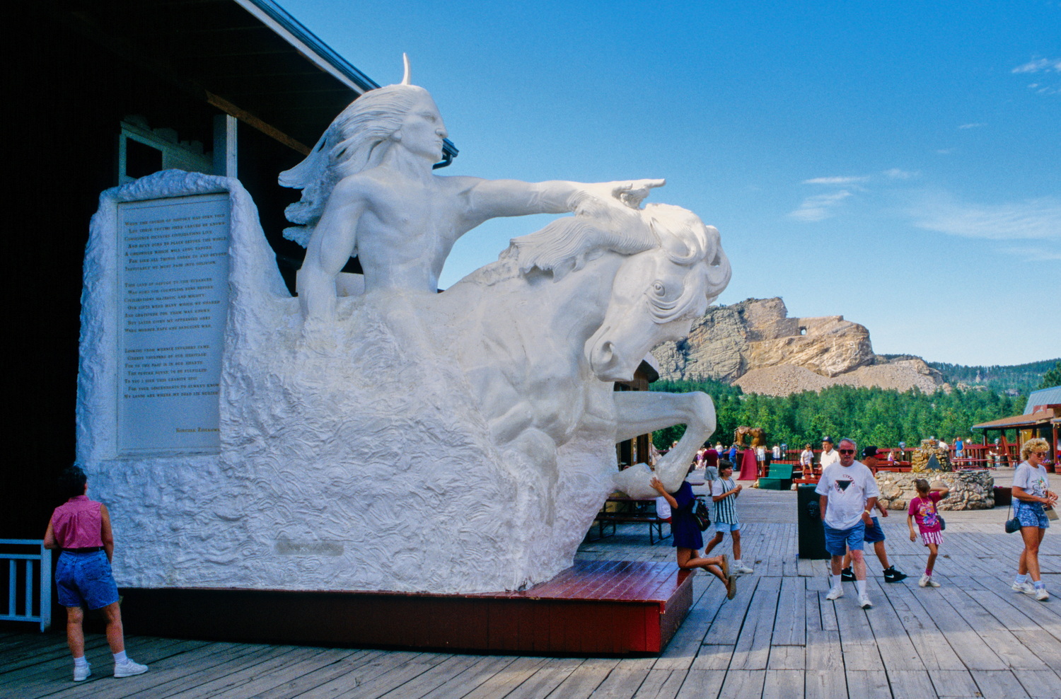 Es ist das Crazy Horse Monument, mit dem der Bildhauer Korczak Ziolkowski bereits 1948 begonnen hat. Als Anführer der Ogala-Sioux kämpfte Crazy Horse selbst in einigen Auseinandersetzungen mit der US-Armee, u.a. am Little Bighorn. Er starb am 5.September 1877 in Fort Robinson- Nebraska. Das Kunstwerk soll mit einer Länge von 195 Metern und einer Höhe von 172 Metern den großen Häuptling hoch zu Ross zeigen, als indigener Gegenpol zu den Präsidenten am Mount Rushmore. Der Bildhauer, der auch am Mount Rushmore mitgewirkt hat verstarb 1982. Fortgesetzt wird das Projekt von seiner Frau und seinen 10 Kindern. Ohne Fördergelder vom Staat beruht die Finanzierung aus den Einnahmen der Crazy Horse- Memorial-Foundation aus Eintrittsgeldern und Spenden. Bis heute 2025 ist das Projekt weiter vorangeschritten, das Gesicht ist fertig und der nach Osten ausgestreckte Arm annähernd. Die Indigenen sehen das Memorial aber kritisch, da es ebenfalls ein Einschnitt in die heiligen Berge der Black Hills darstellt. Ferner ließ sich Crazy Horse wohl nie fotografieren oder abbilden, hätte somit vielleicht auch ein solches Denkmal abgelehnt.