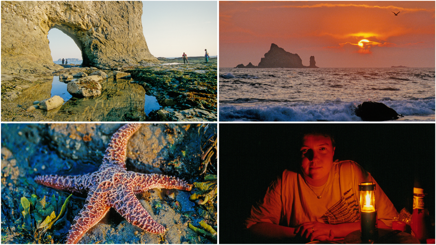 Um 15 Uhr brechen wir dann noch einmal auf zum Hoh- Rain-Forest, wo wir den kurzen „Hall of Mosses-Trail“ durch das regenwaldähnliche Biotop am Hoh-River, an den unteren Hängen der Olympic-Mountains begehen. An der Küste nördlich von Ruby-Beach befindet sich die Hoh- Indian-Reservation. Wir werden hier ordentlich von Mücken attackiert und fahren mit dem Auto am Bogachiel State-Park vorbei zum weiter nördlich an der Küste gelegenen Rialto Beach. Wir erreichen den Strand erst um 19 Uhr und laufen nun bei Ebbe in nördlicher Richtung zum Hole-in-the-Wall- Felsen. Es gibt einiges zu entdecken an den freigelegten Felsen. Seesterne, Seeanemonen, Krebse und seltsame Schalentiere bieten wie auch der Felsbogen selbst schöne Fotomotive. Die Sonne steht tief und hüllt die Küste mit den vorgelagerten Felsen in ein tolles Licht.