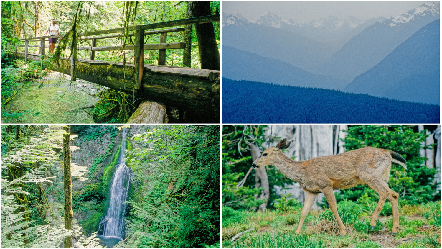 Über die 101 Nord erreichen wir den Lake Crescent, an dessen Südufer wir einen Trail durch den flechtenbehangenen Regenwald zu den Marymere Falls gehen. Wir haben hier eine Begegnung mit einem Reh. Über die 101 Nord erreichen wir die Küste der Juan de Fuca- Wasserstraße als natürliche Grenze zu Kanada. Direkt gegenüber liegt Vancouver-Island mit den gleichnamigen Mountains. Wir fahren nun über den nördlichen Parkeingang zurück in den Olympic-NP hinauf zur Hurricane Ridge. Von hier überblicken wir das Olympus-Gebirge mit seinem höchsten Punkt, den Mount Olympus 2432m. Wetterbedingt liegen die Berge von Vancouver-Island, wie auch die Olympic-Mountains im Dunst. Auch hier tummeln sich zahlreiche Ausflügler, an die die fast handzahmen Rehe offensichtlich gewöhnt sind. Mitten in diesem Ausflugs-Rummel lassen wir uns einen Burger auf der Aussichtsterrasse der Lodge schmecken.