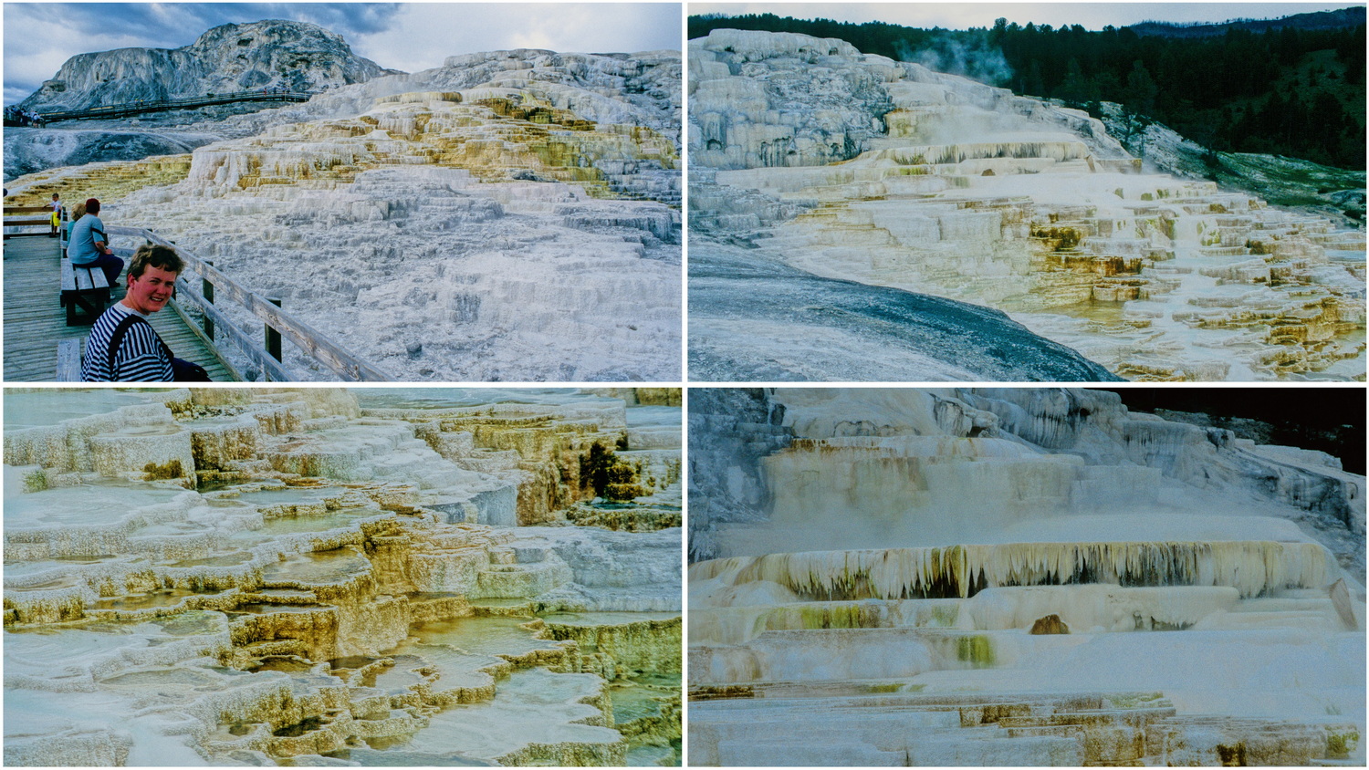 Donnerstagmorgen verlassen wir unser Zelt gegen 9:30 Uhr. Das Wetter ist heute nicht so traumhaft wie gestern. Es ist zwar warm, allerdings weisen die Wolken auf Gewitter hin. Am Abzweig Madison Junction fahren wir heute in nördlicher Richtung zu dem Mammoth Hot Springs. Bei einem großen Waldbrand 1988 ist viel Wald in Yellowstone zerstört worden. Sehenswert sind hier die Kalksinterterrassen. Kalkhaltiges, etwa 70 Grad heißes Wasser hat hier die unzähligen verschiedenfarbigen Becken gebildet, die im Bereich der Minerva-Terrassen besonders schön in Erscheinung treten. Andere Areale sind ihrer Schönheit durch Austrocknung beraubt. Wir fahren noch den Scenic Drive durch die oberen Terrassen ab, um dann die Parkstraße weiter in südöstlicher Richtung zum Yellowstone-Canyon zu nehmen.