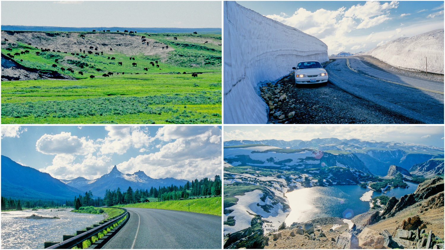 Die nächste Station unterhalb der Straße ist Sulphur Caldron, ein Tümpel mit kochender tiefgelber Schwefelbrühe. Nachdem wir auch hier genug von den übelriechenden Dämpfen aus dem Erdinneren aufgenommen haben, fahren wir noch einmal in nördlicher Richtung über Tower-Roosevelt- Junction weiter zum nordöstlichen Park- Ausgang. Im Yellowstone-NP haben wir eine einzigartige Naturlandschaft erlebt, mit großartigen vulkanischen und geothermalen Erscheinungen. Eine große Anzahl von Wildtieren ist in Yellowstone beheimatet, einige haben wir angetroffen. Beeindruckend sind die vielen Bisons, die bei unserer Ausfahrt aus dem Park durch das Lamar-Tal auf den grünen Hügeln stehen. Sie waren die frühere Nahrungsgrundlage der indigenen Völker und wurden von den weißen Eroberern fast ausgerottet- nur so aus menschlicher Profitgier oder einfach zur Freizeitbeschäftigung. Einige tausend Bisons leben heute wieder in Yellowstone und geben dem Besucher nur eine ungefähre Vorstellung von den riesigen Herden die einst den nordamerikanischen Kontinent durchzogen.